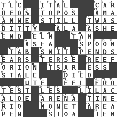 ACROSS 1. Affectionate concern, for short 4. Slanted text style (abbr.) 8. Auto 11. Vintage cars 13. Literary convention 15. Nanny (var.) 16. Singer Murray 17. Not moving 18. It was, poetically 19. Short, simple song 21. In the manner of 22. American tennis player Robert 23. Conclusion 24. Shade tree 27. Scottish cap 29. At sea 30. Soup utensil 34. Keyboard key 36. In a ____ (agitated or irritated) 39. Hangs 40. Hearing organs 41. Laconic 43. Coral ridge 44. Greek mythologigal hunter 46. Russian ruler of old 47. Double-curved letter 48. Showing deterioration from age 49. Passed on 51. Shoshoni 53. Snakelike fish 54. From 57. Trial 60. French article 63. Pale purple color 65. Medicinal plant 66. Sports stadium 69. Prong on a fork 70. _ de Janeiro 71. Music written for nine 72. Length times width 73. Writing instrument 74. Portico 75. "___ Little Indians" DOWN 1. Barter 2. Soviet premier 1918-24 3. Continued (abbr.) 4. It is 5. Small child 6. Capital of Western Samoa 7. Hang loosely or laxly 8. Crow sounds 9. Nursemaid 10. Raze (variant) 12. Arrange properly for use 14. Narrow board 18. ________ with (broke a safety seal) 20. Affirmative reply 25. For fear that 26. French painter Edouard 28. Viper 29. Utter; complete 31. Washington bills 32. Lyric poems 33. Overdraft (abbr.) 34. Small pie 35. Operatic vocal solo 37. Big collection agency 38. Sadhe (variant) 40. Greek goddess of the dawn 42. 4th largest of the Great Lakes 45. Fish or hair follower 50. Pipe bend 52. Enthusiasm 54. Talk or behave amorously 55. Indian princess (variant) 56. Sea 57. Canvas cover 58. Writer Wiesel 59. Within a short period 61. Greek god of love 62. Posted 64. Call ___ day 67. Modern: prefix 68. "One Day ___ Time"
