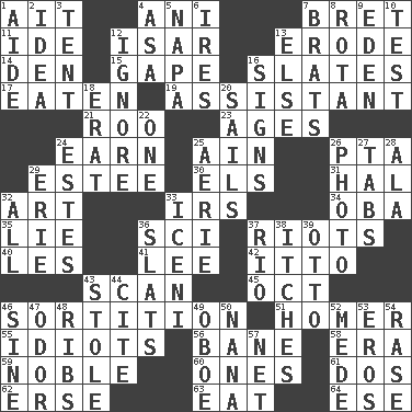 ACROSS 1. Small island 4. Cuckoo 7. Cy Young winner Saberhagen 11. Binary compound 12. Austrian river, tributary to the Danube 13. Wear away 14. Lair 15. Yawn 16. Chalkboards 17. Eroded 19. Aide 21. Friend of Pooh 23. Grows older 24. Merit 25. The 18th letter of the Arabic alphabet 26. Parent Teacher Assoc. 29. First name in cosmetics 30. Raised railways 31. Actor Linden 32. Tate display 33. Big collection agency 34. Chief or king in Benin or Nigeria 35. Falsehood 36. _-fi 37. Disturbances 40. French article 41. Area sheltered from the wind 42. "Tell ____ the Marines!" 43. Examine minutely or intensely 45. Sep. follower 46. Casting lots 51. Baseball hit which scores a run 55. Foolish or stupid persons 56. Object of repulsion 58. Epoch 59. Having high moral qualities 60. Singles 61. Two (Sp.) 62. Celtic language 63. Ingest 64. Compass dir. DOWN 1. Helper 2. The main thing one is thinking about 3. Portable shelter 4. White ___ sheet 5. California wine valley 6. Angers 7. Naughty children 8. Roll call or roster of names 9. Genesis locale 10. Trial 12. Refuse to acknowledge 13. Otherwise 16. Signals 18. Part of Q.E.F. 20. Moves on water 22. Single 24. _____ Park, CO 25. Nest on high 26. Picture 27. Bar bills 28. According to 29. 4th largest of the Great Lakes 32. Everything 33. Ancient Celtic tribe of eastern Britain 36. Narrow boards 37. _ de Janeiro 38. Irritating cutaneous sensations 39. Von Bismarck 43. Took without asking 44. Quote 46. Trig term 47. Scent 48. Chest bones 49. Mitch Miller's instrument 50. Grandmother 52. Ancient Persian 53. Greek god of love 54. Raze (variant) 57. Fish or hair follower