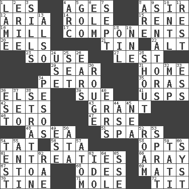 ACROSS 1. French article 4. Eons 8. SW Saudi Arabia district 12. Operatic vocal solo 14. Hero or heavy, e.g. 15. French philosopher Descartes 16. Place where flour is made 17. Pieces 20. Snakelike fish 21. Metal container 22. The first octave above the treble staff 23. Lush 27. For fear that 29. Wither 31. Dwelling 34. Stone: prefix 35. Mouths or openings 36. Otherwise 39. Institute legal proceedings 41. United States Postal Service (abbr.) 42. Puts into a specified state 43. Let have 46. "Corrida" creature 47. Celtic language 48. At sea 51. Practice fights 54. Make lace 56. R.R. building 58. Elects 61. Pleas 66. Like ___ of sunshine 67. Portico 68. Lyric poems 69. Floor protectors 70. Prong on a fork 71. Undercover agent 72. Teat (slang) DOWN 1. Unable to walk 2. 4th largest of the Great Lakes 3. Beverly of Met fame 4. Curve 5. Thick or sticky substance 6. Shade tree 7. Back-to-school mo. 8. "We ___ not amused" (Victoria) 9. Elected representatives 10. International (abbr.) 11. Take ten 13. In addition 18. Lubricate 19. Compass dir. 24. Purpose 25. Arrange properly for use 26. Hearing organs 28. Yell 30. Makeup applied to the cheeks 32. Atlas unit 33. Double-curved letter 34. Mexican monetary units 36. Eastern Standard Time (abbr.) 37. Lion 38. Ski resort town in Vermont 40. Blunders 44. Viper 45. Teachers' org. 49. Compass dir. 50. _ moment's notice (2 wds.) 52. Wander 53. Small fatty European fish 54. Trial 55. Opposed to 57. Tiny particle 59. Jacques of French films 60. System (abbr.) 62. Actress Charlotte 63. Wedding promise 64. Snakelike fish 65. Compass dir.