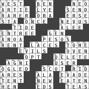 ACROSS 1. Compass direction 5. Benjamin's nick name 8. Modern: prefix 11. Nick name for Arthur 13. Potassium hydroxide 14. Transmit 15. Less widely known 16. Mouth or opening 17. Celtic language 18. R.R. building 19. At one time in the past 21. Congenital growth or mark on the skin 22. Event that recurs at intervals 24. Toward shelter 25. Main course 27. Commissioned mil. rank 29. Small Philippine buffalo 30. Mexican monetary units 32. Monthly bill 33. Shoestrings 35. Heavy book 39. Vices 41. Baking chamber 42. Choose 43. Keyboard key 45. Hindu god of fire 48. One who makes use of a thing 49. Stared 50. Native of Scotland 52. To free from 55. Ancient Greek god of war 56. According to 57. Dodge 59. Portable shelter 60. ___ Haven, CT 61. Eroded 62. Layer 63. Begley and Asner 64. Beverages made from leaves DOWN 1. Armed conflicts 2. Part of Q.E.F. 3. Ski resort town in Vermont 4. Standoff 5. Alliance 6. Jane of fiction 7. Teachers' org. 8. Boldness 9. Follow as a consequence or result 10. Lyric poems 12. Eat (away) 14. Stitch closed the eyes of (a falcon) 20. Born 21. Billionth: prefix 23. Feeling or showing extreme anger 25. Hearing organ 26. Compass dir. 27. Turn to the right 28. Curvy letter 30. Personal Computers (abbr.) 31. Fur scarf 33. Mouth edge 34. Keyboard modifier key 36. Make much ado about nothing 37. Was introduced to 38. Compass dir. 40. Null 43. Superhero pair 44. First name in cosmetics 45. Match 46. American astronaut and politician John 47. Egg locale 49. Pledge 50. Downhill vehicle 51. Crow sounds 53. It may be bright or harebrained 54. Cub Scout units 56. One (Scot) 58. Large container