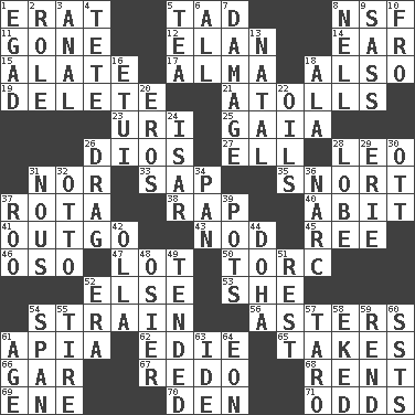 ACROSS 1. Part of Q.E.F. 5. Small amount or degree 8. Science/research agcy. 11. Went 12. Style 14. Ewer handle 15. Having winglike extensions 17. _ mater 18. In addition 19. Keyboard key 21. Ringlike coral islands and reefs 23. RI univ. 25. Greek goddess of the earth (variant) 26. "Vaya con ____" 27. Pipe bend 28. Lion 31. And not 33. Plant excrement 35. Derisive sound 37. Round or rotation of duties 38. Reproach for some lapse or misdeed 40. "This won't hurt ____!" 41. Expenditure 43. Lower and raise head in agreement 45. Portuguese money of account (variant) 46. Bear (Spanish) 47. Car dealer's back yard 50. Torque (variant) 52. Otherwise 53. A female animal or person 54. Put through a sieve 56. Michaelmas daisies 61. Capital of Western Samoa 62. Singer Brickell 65. Receives possession of 66. Slender fish 67. Do over again 68. Monthly bill 69. Compass dir. 70. Lair 71. Likelihood DOWN 1. Mild oath 2. Hero or heavy, e.g. 3. Of or related to the anus 4. False hair 5. Beverage made from leaves 6. 100% 7. Break 8. 1994 drama film starring Jodie Foster 9. Backtalk 10. Away 13. Relating to or accompanying birth 16. Needle case 18. According to 20. Greek god of love 22. Lubricates 24. Austrian river, tributary to the Danube 26. To draw with force 28. Ear part 29. One of the Great Lakes 30. Baseball player Mel 31. Common sense 32. "Beetle Bailey" pooch 34. Baking dish 36. Drug cop 37. Friend of Pooh 39. Plant holders 42. Rounded earthenware pot or jar 44. Capital of the state of Qatar 48. Flexible twig of a willow tree 49. Looked after 51. Take ten 52. Period 54. Connect, as a bridge 55. Hoop that covers a wheel 57. Pacific island yam 58. Supplemented with great effort 59. Tear apart 60. Fast planes 61. Mature 63. Binary compound 64. A really long time