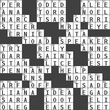 ACROSS 1. For each 4. Wrote a lyric poem 8. Toward shelter 12. Santa ___, CA 13. "Corrida" creature 14. Christmas carol 15. Drug cop 17. Russian ruler of old 18. High-altitude cloud 19. Guide 21. Medical imaging device (abbr.) 23. Sight organ 24. Bert's buddy 26. _ moment's notice (2 wds.) 28. Frog relative 30. Orator 34. Three (prefix) 37. Trust 39. Queen of England 1702-14 40. Tavern 41. Virtuous person 43. Begley and Asner 44. Comedian Laurel of Laurel & Hardy 46. Louse (plural) 47. Eastern Standard Time (abbr.) 48. Pre-World Series prize 51. Assist 54. Followers of ems 55. Trap for birds or small mammals 58. Sandy's bark 61. Not in operation 63. Sadhe (variant) 65. Climbing, woody, usually tropical vines 67. The content of cognition 71. Mild oath 72. "Two Mules for Sister ____" 73. Plunder 74. Biblical high priest 75. Cassini of fashion 76. Relaxation 77. Put into a specified state DOWN 1. Zero-star reviews 2. Maternal 3. More uncommon 4. Baseball player Mel 5. Two (Sp.) 6. Period 7. Dormintory (informal) 8. Cuckoo 9. Old wives' tales, e.g. 10. Suggestive of the supernatural 11. Writer Wiesel 16. Penny 18. Quote 20. River (Sp.) 22. Strike 25. Hearing organs 27. American Automobile Association (abbr.) 29. Started a card game 30. Synchronize (abbr.) 31. Leg joint 32. Extremities 33. Remainder 34. Cook's measure (abbr.) 35. Pace 36. SW Asia republic 38. Cards in a Roman deck? 42. Adolescent 45. Compass dir. 49. Small Philippine buffalo 50. Science/research agcy. 52. Car dealer's back yard 53. Airs 56. Gurus 57. Peak District village in England 58. In addition 59. Monetary unit of Yemen 60. Conductor's collection 62. Do some clerical work 64. Prepare for publication 66. Tired old horse 68. ___ good deed 69. Greek goddess of the dawn 70. Had dinner