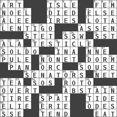 ACROSS 1. Nonscientific branch of learning 4. Capri or Wright 8. Opposite of masc. 11. Christmas carol 13. Passed on 14. Otherwise 15. Toward shelter 16. Angers 17. Globular water bottle used in Asia 18. Small, flat, pigmented spot on the skin 21. NE Netherlands city 22. Proofreading order 23. Compass dir. 25. Fast jet (abbr.) 26. Insect wing 29. One of the two male reproductive glands 32. Twentieth part of a lira 34. _ tizzy (2 wds.) 35. Compass dir. 38. Whine 39. Music written for nine 41. Dormintory (informal) 43. Baking dish 44. The grampus (Milton) 45. Boozer 46. Legislators 50. Fish or hair follower 51. Afternoon social gathering 54. Mayday 55. Printing process, for short 57. Unconcealed 59. Choose not to consume 63. Become fatigued 64. Petty quarrel 67. Periodic rise and fall of the sea level 68. Writer Wiesel 69. 4th largest of the Great Lakes 70. Lyric poems 71. Compass dir. 72. Watch over 73. Erode DOWN 1. Of or related to the anus 2. Hero or heavy, e.g. 3. Adolescent 4. Foolish or stupid persons 5. Title for a knight 6. Area sheltered from the wind 7. Begley and Asner 8. Soft thread for cleaning between teeth 9. _____ Park, CO 10. Intended 12. Allows 14. Raised railways 19. "Tell ____ the Marines!" 20. Turn to the right 21. Leather borer 23. Trig term 24. Scram, to a cat 26. Cleo's killer 27. Central Nebraska county 28. Silent film actress Nazimova 30. Colored lightly or faintly 31. Inside; within (prefix) 33. Cub Scout units 36. Part of speech 37. Celtic language 39. Words to Nanette 40. Mouths or openings 42. Was introduced to 45. Fast planes 47. Eastern Standard Time (abbr.) 48. Spoke pompously 49. Director Reiner 51. Hauls 52. Vices 53. Nest on high 56. Von Bismarck 58. Portuguese money of account (variant) 60. Assistant 61. The content of cognition 62. Egg locale 64. Arrange properly for use 65. Before (prefix) 66. The 18th letter of the Arabic alphabet