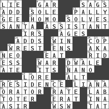 ACROSS 1. Whopper 4. Slender fish 7. Droops 11. Say or write further 12. Not divided or shared with others 13. Chummy 14. Unit of force equal to gravity 15. Same (prefix) 16. Finds the solution 17. Before Barbara or Clara 19. Aide 21. Big collection agency 23. Matures 24. Sums up 25. Acquire through effort 26. Police officer (slang) 29. Obtain by seizing forcibly or violently 30. Followers of ems 31. Alias (abbr.) 32. Modern: prefix 33. Consume 34. To free from 35. Curvy letter 36. Armed conflict 37. A sleeping potion; an opiate (poet.) 40. Had dinner 41. It is 42. Billionth: prefix 43. Old wives' tales, e.g. 45. The first octave above the treble staff 46. Dwelling 51. Woody, climbing, usually tropical plant 55. Speaker 56. Assign a rank or rating to 58. Experiment locale 59. Carrier 60. Part of Q.E.F. 61. _ tizzy (2 wds.) 62. SW Saudi Arabia district 63. Compass dir. 64. Make lace DOWN 1. Falls behind 2. The content of cognition 3. Locale of original sin 4. Thick or sticky substance 5. _ mater 6. Vintage cars 7. Table seasonings 8. Inventor's middle name 9. Small, secluded valley 10. System (abbr.) 12. Broken pieces 13. Airs 16. Signals 18. Event that recurs at intervals 20. Inhabitant of Heaven 22. Fast jet (abbr.) 24. Came up 25. Erodes 26. Monte _, Las Vegas Hotel/Casino 27. Migrant worker of the '30s 28. Groovy apt. 29. Compass direction 32. Teachers' org. 33. Eroded 36. One who wires 37. Heredity factor (abbr.) 38. Place for singles 39. Opposed to 43. 61 cubic inches 44. Aroma 46. Round or rotation of duties 47. Greek god of love 48. Suttee (variant) 49. Ship's personnel 50. Hearing organs 52. Came down and settled, as after flight 53. Nanny 54. Blind as ____ 57. The 23rd letter of the Hebrew alphabet