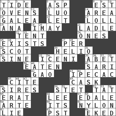 ACROSS 1. Event that recurs at intervals 5. Cleo's killer 8. Eastern Standard Time (abbr.) 11. Baking chambers 13. Nilotic language 14. Length times width 15. An organ shaped like a helmet 16. Allow 17. Hang loosely or laxly 18. Santa ___, CA 19. "If ____ say so..." 21. Dipping utensil 22. Portable shelter 24. Singles 25. Is extant 27. For each 29. Native of Scotland 30. Sun: prefix 32. Trig term 33. Ancient Celtic tribe of eastern Britain 35. Collude with 39. Consumed 41. Indian skirt 42. E Mali city 43. Medicinal drug used to evoke vomiting 45. Quote 48. Keg 49. Fathers 50. Proofreading order 52. Make lace 55. Part of Q.E.F. 56. Area sheltered from the wind 57. Peak District village in England 59. Johnson of "Laugh-In" 60. ___ a Wonderful Life 61. High-strength synthetic material 62. Untruth 63. Pacific Standard Time (abbr.) 64. Supplemented with great effort DOWN 1. Ancient Roman robe 2. "Terrible" tsar 3. Accusation by an informer 4. Compass dir. 5. Silent film actress Nazimova 6. Chop _ 7. Plant holder 8. Wear away 9. Makes a sale 10. Lie 12. Virtuous person 14. ____ Jay Lerner 20. Mountains (abbr.) 21. Australian parrot (variant) 23. First name in cosmetics 25. Double-curved letter 26. One more than ninety 27. Fenced enclosure 28. Biblical high priest 30. Layer 31. Fertile tracts in a desert 33. Call ___ day 34. Corporate head (abbr.) 36. Sass 37. Period 38. Nervous spasm 40. Eons 43. Frozen water 44. Eucharist need 45. High-altitude cloud 46. Feeling or showing extreme anger 47. Wig 49. Lick closed 50. Arranges properly for use 51. Trial 53. _ vera 54. Watch over 56. Mouth edge 58. Color