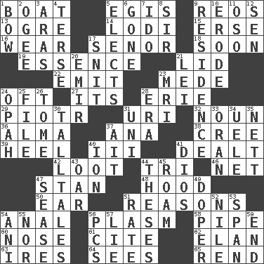 ACROSS 1. Water vessel 5. Armor plate that protects the chest 9. Vintage cars 13. Legendary monster 14. Farming town in central California 15. Celtic language 16. Put on (as clothing) 17. Sir (Sp.) 18. Within a short period 19. Center 21. Flaplike covering 22. Give off 23. Ancient Persian 24. Often (poetically) 27. ___ a Wonderful Life 28. One of the Great Lakes 29. Peter (Polish) 31. RI univ. 32. Part of speech 36. _ mater 37. Santa ___, CA 38. Algonquian 39. Person who is morally reprehensible 40. One more than two 41. Started a card game 42. Plunder 44. Three (prefix) 46. Fish or hair follower 47. Comedian Laurel of Laurel & Hardy 48. Parka part 50. Ewer handle 51. Thinks logically 54. Of or related to the anus 56. Suffix with ecto or cyto 58. Corncob 60. Characteristic smell of wine 61. Quote 62. Liveliness 63. Angers 64. Observes 65. Tear apart DOWN 1. Ribbon knot 2. Double curve, resembling the letter S 3. Ancient river in northeast Turkey 4. Laconic 5. Opts 6. Went 7. Wedding promise 8. Title for a knight 9. Dwelling 10. Wear away 11. Bear (Spanish) 12. Elected rep. 17. In a ____ (agitated or irritated) 20. Arab leader 21. Flowery wreath 23. Medical imaging device (abbr.) 24. Brightly colored fish 25. Do some clerical work 26. Heavy book 28. Period 30. Baron Munchausen's specialties 31. University (slang) 33. NW Algerian seaport 34. Ubangi River tributary 35. Remaining after all deductions 37. Small island 40. Electrically charged atom 41. "Vaya con ____" 43. Rowing implement 44. College papers 45. Wander 47. Gospel singer Marvin 49. Drug addict 51. Assign a rank or rating to 52. The longest river in the world 53. Connect, as a bridge 54. Black tropical American cuckoo 55. And not 56. Personal Computers (abbr.) 57. Falsehood 59. Conclude