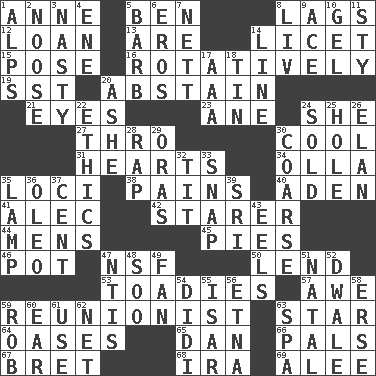 ACROSS 1. Queen of England 1702-14 5. Benjamin's nick name 8. Fails to keep up a pace 12. Grant temporary use of 13. "We ___ not amused" (Victoria) 14. It is permitted: Lat. 15. Introduce or present, as a question 16. Producing rotation 19. Fast jet (abbr.) 20. Choose not to consume 21. Snake ____ (dice throw) 23. A saturated hydrocarbon 24. A female animal or person 27. Through, poetically 30. Calm and collected 31. Centers of feelings and intuitions 34. Rounded earthenware pot or jar 35. Venues 38. Aches 40. Arabian gulf 41. Actor Baldwin 42. A viewer who gazes fixedly 44. Not women's 45. Sliced desserts 46. Cooking vessel 47. Science/research agcy. 50. Grant temporary use of 53. Sycophants 57. Deep reverence 59. One who advocates reunion 63. Play the lead 64. Fertile tracts in a desert 65. One of the 12 tribes of Israel 66. Friends 67. Cy Young winner Saberhagen 68. Retirement account (abbr.) 69. Toward shelter DOWN 1. High mountains 2. Trap for birds or small mammals 3. Thoroughly unpleasant 4. Compass dir. 5. Sharp remark 6. Greek god of love 7. Remaining after all deductions 8. 54 in ancient Rome 9. Adept person 10. Set 11. Filthy place 14. Actor's bit 17. American Automobile Association (abbr.) 18. Shallow baking pan 20. American tennis player Robert 22. Moral principles 24. Exchanged or delivered for money 25. Opening into or through something 26. Enthusiasm 28. Strike 29. Mouths or openings 30. Unrefined 32. Teat (slang) 33. Fastener 35. Desk light 36. Butter sub 37. Penny 39. _ Lanka 43. Snakelike fish 47. Nuclear Threat Initiatives 48. "Barney Miller" actor Jack 49. Air blower 51. Relating to or accompanying birth 52. A sleeping potion; an opiate (poet.) 54. "You Light Up My Life" star Conn 55. Austrian river, tributary to the Danube 56. Inactive volcano in Sicily 58. Celtic language 59. Director Reiner 60. Ewer handle 61. Purpose 62. Fish or hair follower 63. Health resort