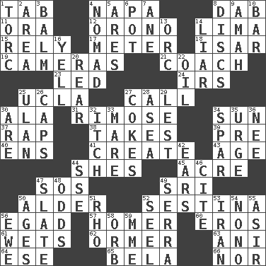 ACROSS 1. Keyboard key 4. California wine valley 8. Small moist lump or mass 11. Mouth or opening 12. U. of Maine site 14. Pale green bean 15. Have trust in 17. Distance measurement 18. Austrian river, tributary to the Danube 19. Devices for capturing images 21. Team commander 23. Directed 24. Big collection agency 25. Southern CA. univ. 27. Give a ring to 30. Insect wing 31. Full of chinks, cracks, or crevices 34. Player for Phoenix 37. Strike 38. Proceeds 39. Before (prefix) 40. Followers of ems 41. Cause to be 43. Ripen 44. "______ My Girl" (Turtles hit) 45. Land measure 47. Mayday 49. Indian title of respect (Mr.) 50. Tree or shrub in the Birch family 52. French poetic form 56. Mild oath 57. Home run 60. Greek god of love 61. Soaks 62. Abalone 63. Black tropical American cuckoo 64. Compass dir. 65. Actor Lugosi 66. And not DOWN 1. Torque (variant) 2. Length times width 3. Lip ointment 4. Wanderer 5. Ancient Greek god of war 6. Plant holder 7. One (Scot) 8. Plates 9. Nursemaid 10. Drinking establishment 13. The grampus (Milton) 14. One who doesn't tell the truth 16. Shout 20. Buttocks 22. Lubricate 25. ____ Bator 26. Smile enhancers 27. Popular sodas 28. Toward the sea 29. For fear that 30. "We ___ not amused" (Victoria) 32. Hankering 33. Female horse 34. Coast Guard woman 35. Goad 36. Born 42. Hearing organs 44. Compass dir. 46. Quote 47. Chalkboard 48. Probability 49. Father Junipero _ 50. Eons 51. 17th letter of the Greek alphabet 52. Stitch closed the eyes of (a falcon) 53. SW Asia republic 54. Words to Nanette 55. SW Saudi Arabia district 56. She-sheep 58. Globe 59. Madame (abbr.)