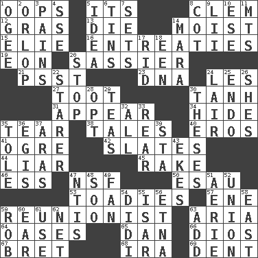 ACROSS 1. I made a mistake 5. It is 8. Clement's nick name 12. Pate de foie ____ 13. Expire 14. Wet 15. Writer Wiesel 16. Pleas 19. Period of immesurable duration 20. More lively and spirited 21. Inconspicuous attention getter 23. Heredity factor (abbr.) 24. French article 27. A blast of a horn 30. Hyperbolic tangent 31. Seem 34. Flintstone garb 35. Rend 38. Stories 40. Greek god of love 41. Legendary monster 42. Chalkboards 44. One who doesn't tell the truth 45. Immoral or dissolute person 46. Curvy letter 47. Science/research agcy. 50. Son of Isaac 53. Sycophants 57. Compass dir. 59. One who advocates reunion 63. Operatic vocal solo 64. Fertile tracts in a desert 65. Daniel's nick name 66. "Vaya con ____" 67. Cy Young winner Saberhagen 68. Lyricist Gershwin 69. Incision DOWN 1. Double curve, resembling the letter S 2. Lowest deck of a ship 3. Aches 4. Compass dir. 5. The main thing one is thinking about 6. Canisters 7. Puts into a specified state 8. Small bed 9. Cards in a Roman deck? 10. Compass dir. 11. Mountains (abbr.) 14. Hindu Mythology: god of death 17. To free from 18. Car or cant ending 20. Halt 22. A viewer who gazes fixedly 24. Den 25. Inside; within (prefix) 26. "______ My Girl" (Turtles hit) 28. Elect 29. Afternoon social gatherings 30. College papers 32. 100% 33. Posterior 35. Lacquered or enameled metalware 36. The front part of a cuirass 37. Caspian sea tributary 39. R.R. building 43. Supplements with great effort 47. Nuclear Threat Initiatives 48. "Barney Miller" actor Jack 49. Air blower 51. Nest on high 52. The state of being joined or united 54. "You Light Up My Life" star Conn 55. Austrian river, tributary to the Danube 56. Inactive volcano in Sicily 58. 90 degrees 59. Director Reiner 60. Hearing organ 61. Purpose 62. Fish or hair follower 63. Say or write further