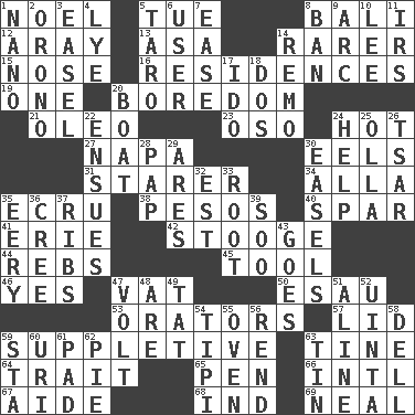 ACROSS 1. Christmas carol 5. Third day of the wk. 8. Indonesian resort city 12. Like ___ of sunshine 13. White ___ sheet 14. More valued for its uncommonness 15. Characteristic smell of wine 16. Dwellings 19. Single 20. Mood resulting from idleness 21. Margarine 23. Bear (Spanish) 24. Being at a high temperature 27. California wine valley 30. Snakelike fish 31. A viewer who gazes fixedly 34. Silent film actress Nazimova 35. Shade of tan 38. Mexican monetary units 40. Practice fight 41. One of the Great Lakes 42. Moe Howard, for one 44. Confederate soldiers (slang) 45. Implement 46. Consenting reply 47. Large container 50. Son of Isaac 53. Speakers 57. Hat (slang) 59. Supplying deficiencies 63. Prong on a fork 64. Distinguishing feature 65. Fenced enclosure 66. International (abbr.) 67. Helper 68. Working for oneself (abbr.) 69. Be tempered by heat DOWN 1. Billionth: prefix 2. U. of Maine site 3. Artist's stand 4. Sodium hydroxide 5. Edible starchy tuberous root 6. One who uses or employs something 7. Comfort 8. Prohibit 9. Curve 10. Area sheltered from the wind 11. Big collection agency 14. San ____ (Riviera town) 17. Wedding promise 18. Two (Sp.) 20. Water vessel 22. Follows as a consequence or result 24. Assist 25. Spanish pot 26. Russian ruler of old 28. Infant food 29. Ancient Greek god of war 30. Artist's stands 32. Eastern Standard Time (abbr.) 33. Carrot, for example 35. Suggestive of the supernatural 36. Algonquian 37. Teases 39. "Barney Miller" actor Jack 43. Travels 47. Electrical Unit 48. "We ___ not amused" (Victoria) 49. Make lace 51. Place in a line 52. National forest in Provo, Utah 54. Native american tent (variation) 55. Baking chamber 56. Tear apart 58. Small valley 59. R.R. building 60. RI univ. 61. Groovy apt. 62. Sliced dessert 63. Metal container