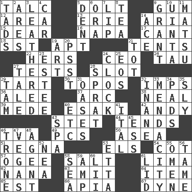 ACROSS 1. Baby powder 5. Stupid person 9. Chewing product 12. Type of rug 13. 4th largest of the Great Lakes 14. Roberta Peters solo 15. Letter starter 16. California wine valley 17. Patter 18. Fast jet (abbr.) 19. Fitting 21. Portable shelters 22. Possessive pronoun 24. Corporate head (abbr.) 26. The 19th letter of the Greek alphabet 27. Trials 28. Position in a hierarchy or organization 29. Small pie 30. Literary convention 32. Naughty children 36. Toward shelter 37. Curve 38. Anneal 39. Ancient Persian 40. 1973 Nobel Price Winner (Physics) Leo 42. "60 Minutes" Commentator Rooney 43. Proofreading order 44. Is inclined (to) 46. Federal power corp. 49. Personal Computers (abbr.) 50. At sea 51. Rain (Swedish) 53. Raised railways 54. Small bed 57. Double curve, resembling the letter S 58. Table seasoning 61. Pale green bean 62. Nanny 63. Send forth 64. A distinct part 65. Eastern Standard Time (abbr.) 66. Capital of Western Samoa 67. Centimeter-gram-second unit of force DOWN 1. Bits 2. Ancient Greek god of war 3. Tough but pliablecoriaceous 4. Automobile 5. Incision 6. Mouth or opening 7. Mouth edge 8. Beverage made from leaves 9. Let have 10. National forest in Provo, Utah 11. Taiwanese island in East China Sea 14. Adept person 19. Nonscientific branch of learning 20. Inconspicuous attention getter 21. Small child 23. First name in cosmetics 24. Timepiece 25. Greek goddess of the dawn 27. Lie 28. Small fatty European fish 29. Scottish cap 31. Fertile tracts in a desert 32. Silly 33. Ananias' fault 34. Groovy apts. 35. Insidious 40. And so on (abbr.) 41. Slanted text style (abbr.) 43. Health resort 45. Double-curved letter 46. Heavy duty weighing machine 47. Viva Las _ 48. Representative 52. Teachers' org. 53. Singer James 55. Presage 56. Docile 58. Ocean 59. Electrical Unit 60. Cards in a Roman deck? 61. Flaplike covering