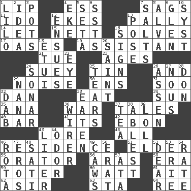 ACROSS 1. Mouth edge 4. Curvy letter 7. Settles 11. Wedding promise 12. Supplements with great effort 13. Friendly 14. Allow 15. Remaining after all deductions 16. Finds the solution 17. Fertile tracts in a desert 19. Helper 21. Third day of the wk. 23. Eons 24. Chop _ 25. Shallow baking pan 26. Plus 29. Annoying sound 30. Followers of ems 31. "Barney Miller" actor Jack 32. One of the 12 tribes of Israel 33. Erode 34. Player for Phoenix 35. Santa ___, CA 36. Armed conflict 37. Lies 40. Long, evenly shaped piece 41. It is 42. Inky black, to poets 43. Old wives' tales, e.g. 45. Everything 46. Dwelling 51. A person who is older than you are 55. Speaker 56. Ancient river in northeast Turkey 58. Epoch 59. Carrier 60. Electrical Unit 61. Small island 62. SW Saudi Arabia district 63. R.R. building 64. To riddle DOWN 1. _ and Stitch 2. The content of cognition 3. Plant holders 4. Supplement with great effort 5. Bristle 6. Fast planes 7. Table seasonings 8. Inventor's middle name 9. Small, secluded valley 10. System (abbr.) 12. Follows as a consequence or result 13. Airs 16. Omens 18. Needle holder 20. Inhabitant of Heaven 22. Sight organ 24. Echolocation 25. Lacerates 26. NE Netherlands city 27. Common sense 28. Spanish title 29. Grandmother 32. Apply (a substance) by light strokes 33. Eroded 36. One who wires 37. Afternoon social gathering 38. Most capable 39. Hang loosely or laxly 43. 61 cubic inches 44. Scent 46. Round or rotation of duties 47. Greek god of love 48. Suttee (variant) 49. Crow sounds 50. Part of Q.E.F. 52. Letter starter 53. 4th largest of the Great Lakes 54. Pace 57. _ moment's notice (2 wds.)