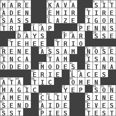 ACROSS 1. Female horse 5. Polynesian shrub of the pepper family 9. Be seated 12. An important port of Yemen 13. Independent ruler or chieftain 14. Hoop that covers a wheel 15. Backtalk 16. Goldbrick 17. Composer Stravinsky 18. Three (prefix) 19. Infant locale 21. Actor Sean's family 22. 24-hour periods 24. Distant 26. Compass dir. 27. Giggle 28. Musical group of three 29. French philosopher Descartes 30. Indian state 32. Sense of smell 36. South American Indian 37. Scottish cap 38. Austrian river, tributary to the Danube 39. Wrote a lyric poem 40. Methods 42. Inactive volcano in Sicily 43. 4th largest of the Great Lakes 44. Shoestrings 46. _ moment's notice (2 wds.) 49. Nervous spasm 50. Sign of things to come 51. Mysterious quality of enchantment 53. Slangy assent 54. Boy, to dad 57. So be it 58. 154 in Roman numerals 61. Trig term 62. Transmit 63. Helper 64. Nights before holidays 65. Fast jet (abbr.) 66. Sliced desserts 67. Trial DOWN 1. Vertical spar for supporting sails 2. The sixth month of the Jewish calendar 3. Dwelling 4. Followers of ems 5. Seaweed 6. Housemaid (var.) 7. Namely 8. "We ___ not amused" (Victoria) 9. Public displays of written messages 10. Metal shackles 11. Laconic 14. Neckwear 19. Potassium hydroxide 20. Toward the sea 21. Adept person 23. Having the leading position 24. Movie unit 25. Direct toward a target or goal 27. Be inclined (to) 28. Sadhe (variant) 29. _ de Janeiro 31. Unemotional 32. Sibling's daughter 33. Clearly or manifestly demonstrative 34. Without 35. Epoch 40. Medical imaging device (abbr.) 41. _ gin 43. And so on (abbr.) 45. Electrical Unit 46. Collect or gather 47. Softens 48. Rep 52. Working for oneself (abbr.) 53. Jacques Cousteau's middle name 55. Singles 56. A home for chicks 58. Head covering 59. Cards in a Roman deck? 60. Binary compound 61. Put into a specified state