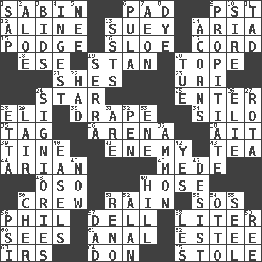 ACROSS 1. Unit of acoustic absorption 6. Writing tablet 9. Pacific Standard Time (abbr.) 12. Place in a line 13. Chop _ 14. Operatic vocal solo 15. Plash 16. _ gin 17. Drawstring 18. Compass dir. 19. Comedian Laurel of Laurel & Hardy 20. Drink excessively 21. "______ My Girl" (Turtles hit) 23. RI univ. 24. Play the lead 25. Keyboard key 28. Connecticut Ivy Leaguer 30. Window treatment 34. Grain storage tower 35. Label 36. Sports stadium 38. Small island 39. Prong on a fork 41. Foe 43. Beverage made from leaves 44. Believer in; advocate of (suffix) 46. Ancient Persian 48. Bear (Spanish) 49. Stockings 50. Group working together 51. Precipitation 53. Distress signal 56. Silvers or Donahue 57. Small valley 58. 61 cubic inches 60. Observes 61. Of or related to the anus 62. First name in cosmetics 63. Big collection agency 64. Spanish title 65. Fur scarf DOWN 1. Plant excrement 2. Medicinal plant 3. Auction offers 4. Eat 5. Born 6. Monetary unit of Botswana 7. A really long time 8. Color 9. Appease 10. The founder of a family 11. Bit 13. Fast planes 14. Oak nuts 19. Father Junipero _ 20. Third day of the wk. 22. Possessed 24. Seigniories (variant) 26. Writer Wiesel 27. Roll call or roster of names 28. Singer James 29. Den 31. "We ___ not amused" (Victoria) 32. Writing instrument 33. Compass dir. 37. ID or VA city 40. Artist's stands 42. Consenting reply 45. Immediately 47. Cease 49. Land elevation 50. "Mermaids" star 51. Western Nevada city 52. Actor Alda or Thicke 54. "Beetle Bailey" pooch 55. Sew up the eyelids of hawks and falcons 56. 23rd letter of the Greek alphabet 57. June honoree 58. French article 59. To separate or throw off