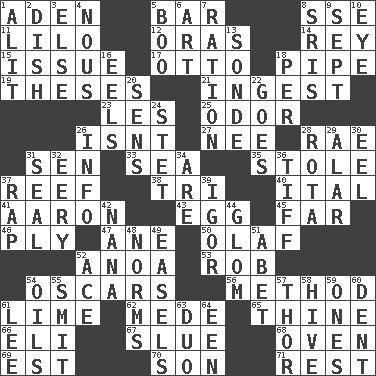 ACROSS 1. Arabian gulf 5. Long, evenly shaped piece 8. Compass dir. 11. _ and Stitch 12. Mouths or openings 14. Marina Del _, California 15. Come out of 17. "Beetle Bailey" pooch 18. Corncob 19. College papers 21. Swallow 23. French article 25. Aroma 26. Is not 27. Born 28. Actress Charlotte 31. Elected rep. 33. Ocean 35. Fur scarf 37. Coral ridge 38. Three (prefix) 40. Slanted text style (abbr.) 41. Composer Copland 43. Oval reproductive body of a fowl 45. Distant 46. Travel a route regularly 47. One (Scot) 50. Norwegian king 52. Small Philippine buffalo 53. Director Reiner 54. Motion picture awards 56. Mode 61. Welles in "The Third Man" 62. Ancient Persian 65. One or ones belonging to thee 66. Biblical high priest 67. Turn sharply 68. Baking chamber 69. Eastern Standard Time (abbr.) 70. Male child 71. Take ten DOWN 1. Set down 2. Food container 3. Otherwise 4. Horse sense 5. Sometimes accompanies a hiss 6. Tate display 7. Food allowance for one day 8. Indian titles of respect 9. Back-to-school mo. 10. Sight organ 13. Something which is sent 16. Snakelike fish 18. For each 20. Elected reps. 22. Moves 24. Proofreading order 26. A message received and understood 28. Round or rotation of duties 29. Having or resembling wings 30. Snakelike fish 31. Lick closed 32. Suggestive of the supernatural 34. "We ___ not amused" (Victoria) 36. Small quarrel 37. Hit sharply and swiftly 39. Composer Stravinsky 42. Nanny 44. Seize upon or latch onto something 48. Typical models 49. Artist's stands 51. Collude with 52. Adept person 54. Petroleums 55. Stricken, poetically 57. Son of Odin 58. Hub of activity 59. Singles 60. Scratch 61. Area sheltered from the wind 63. Superhero pair 64. Car or cant ending