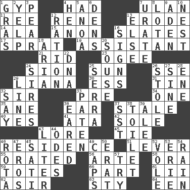 ACROSS 1. Con 4. Possessed 7. ____ Bator 11. To separate or throw off 12. French philosopher Descartes 13. Wear away 14. Chicken ___ king 15. At once, immediately (arch.) 16. Chalkboards 17. Small fatty European fish 19. Helper 21. To free from 23. Double curve, resembling the letter S 24. The Jewish people; Israel 25. Player for Phoenix 26. Compass dir. 29. Climbing, woody, usually tropical vines 30. Double-curved letter 31. Metal container 32. Title for a knight 33. Before (prefix) 34. Single 35. One (Scot) 36. Ewer handle 37. Having lost freshness 40. Affirmative reply 41. _ moment's notice (2 wds.) 42. Flatfish 43. Old wives' tales, e.g. 45. Neckwear 46. Home 51. Crowbar 55. Declaimed 56. Johnson of "Laugh-In" 58. Mouth or opening 59. Lugs 60. Role in a play 61. Cards in a Roman deck? 62. SW Saudi Arabia district 63. Filthy place 64. Car or cant ending DOWN 1. Pate de foie ____ 2. Sharp bark 3. Lightbulb-shaped fruit 4. Layer 5. Small Philippine buffalo 6. Habitations of wild animals 7. A salt of uric acid 8. Globular water bottle used in Asia 9. Arabian gulf 10. A home for chicks 12. Food allowance for one day 13. Otherwise 16. Omens 18. Roberta Peters solo 20. Lush 22. Heredity factor (abbr.) 24. Begets 25. Father Junipero _ 26. Fur scarf 27. Trig term 28. Compass dir. 29. Actor's bit 32. Declare 33. Eucharist need 36. Having ears or earlike features 37. Fast jet (abbr.) 38. Rest room 39. Toward shelter 43. 61 cubic inches 44. Lyric poems 46. Roll call or roster of names 47. Greek god of love 48. Suttee (variant) 49. Smile enhancers 50. Part of Q.E.F. 52. Short-tailed, large-bodied rat 53. 4th largest of the Great Lakes 54. Water falling in drops from the sky 57. Attempt