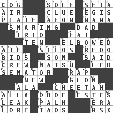 ACROSS 1. Gear tooth 4. Flatfish 8. Bristle 12. Wind 13. A slight indication 14. The front part of a cuirass 15. Food holder 18. Age 19. Nanny 20. Catching in a trap 22. Male parent 23. Musical group of three 24. Consume 25. Nine, plus one 26. Turned at an angle; bent 30. Had dinner 33. Grain storage towers 36. Redecorate 37. Auction offers 39. Boy, to dad 40. Stated 41. Group working together 42. Taiwanese island in East China Sea 44. Directed 45. Legislator 47. Strike 50. ___ Haven, CT 51. Take by theft 53. Wing 54. Leopard's kin 57. Silent film actress Nazimova 59. Mitch Miller's instrument 61. _____ Park, CO 63. Path through which fluid escapes 64. Inside of hand 65. Period 66. Old wives' tales, e.g. 67. Small amounts or degrees 68. Acura sports coupe DOWN 1. Head covering 2. Petroleums 3. Let have 4. Skim 5. Cassini of fashion 6. Nilotic language 7. Car or cant ending 8. Elected representatives 9. Mild oath 10. Metal container 11. White ___ sheet 16. Small pie 17. One of the Great Lakes 21. Charged atoms 22. Apply (a substance) by light strokes 24. Raised railways 26. Immeasurably long periods of time 27. Welt 28. Singer Brickell 29. Texas town _ City 30. Lettered men learn these first 31. Hoop that covers a wheel 32. Locale of original sin 34. Austrian river, tributary to the Danube 35. Car dealer's back yard 38. Tchaikovsky ballet 42. Cut the grass 43. Goad 46. Afternoon social gathering 48. Toward shelter 49. Cooking vessels 52. Mother 53. Having or resembling wings 54. Having a low temperature 55. Equivocates 56. Possessive pronoun 57. 100% 58. Lion 59. Elect 60. Sound made by sheep 62. Saxophone