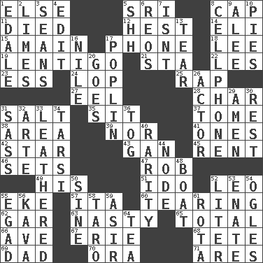 ACROSS 1. Otherwise 5. Indian title of respect (Mr.) 8. Head covering 11. Passed on 12. Command 14. Biblical high priest 15. With great haste 17. Give a jingle 18. Area sheltered from the wind 19. Small, flat, pigmented spot on the skin 21. R.R. building 22. French article 23. Curvy letter 24. Trim (branches) 25. Reproach for some lapse or misdeed 27. Snakelike fish 28. Burn to charcoal 31. Table seasoning 35. Be seated 37. Heavy book 38. Length times width 39. Or not 41. Singles 42. Play the lead 43. Separate the seeds from cotton 45. Monthly bill 46. Puts into a specified state 47. Director Reiner 49. Part of HMS, perhaps 51. Wedding promise 52. Lion 55. Make supply last 57. Call ___ day 60. Separating forcefully 62. Slender fish 63. Thoroughly unpleasant 65. "_____ Recall" 66. "___ Maria" 67. 4th largest of the Great Lakes 68. Wig 69. June honoree 70. Mouth or opening 71. Ancient Greek god of war DOWN 1. Peak District village in England 2. Citrus fruits 3. Seines 4. Prepare for publication 5. Quiet! 6. Vintage cars 7. Is not 8. Portable communications device 9. Toward shelter 10. Sliced desserts 13. Pull apart 16. The longest river in the world 17. Cotton for raincoats, e.g. 20. Leaves 26. Thespian 29. So be it 30. Relief 31. Backtalk 32. Johnson of "Laugh-In" 33. Resembling or made to resemble leather 34. Tarsus (plural) 36. Coat; cloak 40. Noteworthy scarcity 44. Connecting point 48. Water vessel 50. Trig term 52. 61 cubic inches 53. Maternal 54. Stares at amorously 55. Mild oath 56. Polynesian shrub of the pepper family 58. Pacific island yam 59. SW Saudi Arabia district 61. Roll call or roster of names 64. Afternoon social gathering