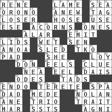 ACROSS 1. French philosopher Descartes 5. Unable to walk 9. Ocean 12. U. of Maine site 14. Afresh 15. Label 16. Failure 17. Stockings 18. Purpose 19. Compass dir. 20. Oak nuts 23. Singles 24. Having or resembling wings 25. Give off 27. Hats (slang) 30. Soggy 32. Elected rep. 33. Small Philippine buffalo 34. Downhill vehicle 36. Ring climax 38. Groovy apt. 39. A female animal or person 40. Myrna of the movies 43. Spanish title 46. Snakelike fish 48. A slight indication 49. Teachers' org. 51. Snakelike fish 52. Raised platform 53. Lyric poems 54. Bits 56. Inside; within (prefix) 58. Cylindrical with tapered ends 61. Health resort 64. Male parent 65. Ancient Persian 66. Pitcher Ryan 68. One (Scot) 69. Musical group of three 70. Distinguishing feature 71. Spoil 72. Fast planes 73. Hindu god of fire DOWN 1. Hero or heavy, e.g. 2. Greek god of love 3. Characteristic smell of wine 4. Compass dir. 5. Cowardly lion portrayer 6. At once, immediately (arch.) 7. Makes clutter 8. She-sheep 9. Difficult or unusual or dangerous feat 10. Comfort 11. Grows older 13. Of the mouth 21. Crow sounds 22. Threatening words 23. Pig sound 24. White ___ sheet 26. Was introduced to 27. Pet locale 28. _ tizzy (2 wds.) 29. Texas town _ City 31. Giggle 35. Erase 37. Rounded earthenware pot or jar 41. Fr. "Yes" 42. It is so 44. Southwest Nigerian state 45. Born 47. Narrow board 48. Music discs 50. Michaelmas daisies 53. More peculiar 55. Scratch 56. Dutch treat 57. Nanny 59. Prepare for publication 60. Vintage cars 61. Volcanic refuse 62. Ache 63. Opposed to 65. Mountains (abbr.) 67. Mouth or opening