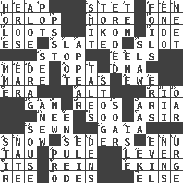 ACROSS 1. Pile 5. Proofreading order 9. Opposite of masc. 12. Fourth or lowest deck 14. Greater amount 15. Single 16. Plunders 17. Visual representation of an object 18. Binary compound 19. Compass dir. 20. Scheduled 23. Narrow, elongated depression 24. Close up, plug up 25. Snakelike fish 27. Ancient Persian 30. Choose 32. Heredity factor (abbr.) 33. Female horse 34. Afternoon social gatherings 36. She-sheep 38. Epoch 39. The first octave above the treble staff 40. River (Sp.) 43. Separate the seeds from cotton 46. Vintage cars 48. Roberta Peters solo 49. Born 51. "Barney Miller" actor Jack 52. SW Saudi Arabia district 53. Stitched 54. Greek goddess of the earth (variant) 56. Overwhelm 58. Spring feasts 61. Australian flightless bird 64. The 19th letter of the Greek alphabet 65. Whimper 66. Prying instrument 68. ___ a Wonderful Life 69. It's straight from the horse's mouth 70. Supplementing with great effort 71. To sift 72. Lyric poems 73. Otherwise DOWN 1. Opening into or through something 2. Greek god of love 3. Medicinal plant 4. Cooking vessel 5. Stricken, poetically 6. Puff or smoke 7. Worn away 8. "___ Little Indians" 9. Fencing necessities 10. Inside; within (prefix) 11. Rendezvous 13. Inconspicuous attention getter 21. Plunder 22. Become visible 23. Cole _ (cabbage dish) 24. Perceive with the eye 26. Compass dir. 27. Madame (abbr.) 28. Hearing organ 29. To trail on the ground 31. Lies 35. Moe Howard, for one 37. Blunders 41. One more than two 42. Rowing implement 44. Afresh 45. ___ Haven, CT 47. Fly high 48. Auto club (abbr.) 50. Took place subsequently 53. Boozer 55. Small island 56. Disorderly outburst 57. Nathan's nickname 59. Writer Wiesel 60. Lairs 61. Tending to cause great harm 62. Not women's 63. Goad 65. Adept person 67. Supplement with great effort