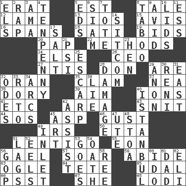 ACROSS 1. Part of Q.E.F. 5. Eastern Standard Time (abbr.) 8. Story 12. Unable to walk 13. "Vaya con ____" 15. Advice 16. Connects, as a bridge 18. Suttee (variant) 19. Auction offers 20. Infant food 22. Modes 24. Otherwise 26. Corporate head (abbr.) 27. Nuclear Threat Initiatives 28. Spanish title 29. "We ___ not amused" (Victoria) 32. Northwest Algerian city 35. Dollar (slang) 37. Teachers' org. 38. Rowboat 39. Direct toward a target or goal 40. Charged atoms 41. And so on (abbr.) 42. Length times width 43. In a ____ (agitated or irritated) 44. Distress signal 45. Cleo's killer 46. Abrupt rush of wind 49. Big collection agency 50. Singer James 51. Small, flat, pigmented spot on the skin 55. A really long time 56. Highlander 57. Fly high 59. Remain 63. Stare at amorously 64. Wig 65. Freehold land 66. Inconspicuous attention getter 67. A female animal or person 68. Farming town in central California DOWN 1. Raised railways 2. Hit sharply and swiftly 3. Wet nurse (var.) 4. 3-inch nail 5. Begley and Asner 6. Thailand, formerly 7. Carryall 8. Off limits 9. Enthusiastic 10. Flaplike coverings 11. Double-curved letter 14. "Cheers" or "Ellen" 17. Table seasoning 21. Air pressure measure (abbr.) 23. Layer 25. Fortification 28. Break 29. At once, immediately (arch.) 30. Painter Guido (1575-1642) 31. 90 degrees 32. Lyric poems 33. Printing process, for short 34. Curves 36. Untruth 40. Byzantium, centuries later 42. Aid 45. Nonscientific branch of learning 47. Shoshoni 48. Portico 49. An arm off of a larger body of water 51. Straggles 52. Snakelike fish 53. Leaves 54. Pledge 56. Republican Party 58. To sift 60. Wedding promise 61. Male parent 62. Connecticut Ivy Leaguer