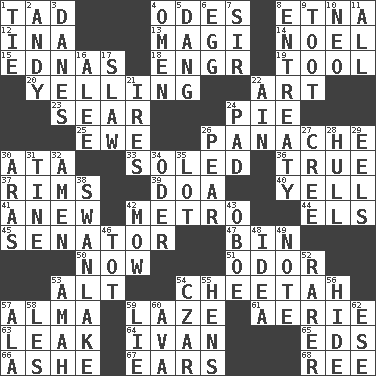 ACROSS 1. Small amount or degree 4. Lyric poems 8. Inactive volcano in Sicily 12. _ tizzy (2 wds.) 13. Wise men 14. Christmas carol 15. Ferber et al. 18. Engineer (abbr.) 19. Instrument 20. Crying or shouting loudly 22. Tate display 23. Dry up 24. Sliced dessert 25. She-sheep 26. Flamboyance 30. "One Day ___ Time" 33. Having a sole or soles 36. Loyal 37. Basketball hoops 39. ___ good deed 40. Shout 41. Afresh 42. Paris' subway 44. Raised railways 45. Legislator 47. Storage container 50. Immediately 51. Aroma 53. The first octave above the treble staff 54. Leopard's kin 57. _ mater 59. Goldbrick 61. Nest on high 63. Path through which fluid escapes 64. "Terrible" tsar 65. Begley and Asner 66. American tennis player Robert 67. Hearing organs 68. To riddle DOWN 1. Neckwear 2. "60 Minutes" Commentator Rooney 3. Natives or inhabitants of Denmark 4. Sign of things to come 5. Mild oath, euphamism for damn 6. Ovum 7. Title for a knight 8. Plea 9. A blast of a horn 10. Modern: prefix 11. 100% 16. Toward shelter 17. Cole _ (cabbage dish) 21. Angers 22. The 18th letter of the Arabic alphabet 24. Groovy apt. 26. Lightbulb-shaped fruit 27. Algonquian 28. Frame or body of a ship 29. Snakelike fish 30. Caspian sea tributary 31. Prong on a fork 32. So be it 34. River in Europe 35. Car dealer's back yard 38. Tchaikovsky ballet 42. Cut the grass 43. Mitch Miller's instrument 46. Small child 48. The content of cognition 49. Musical sound 52. Less widely known 53. Housemaid 54. Russian ruler of old 55. Coop moms 56. Flintstone garb 57. Chicken ___ king 58. French article 59. Untruth 60. Actress Gardner 62. Compass dir.
