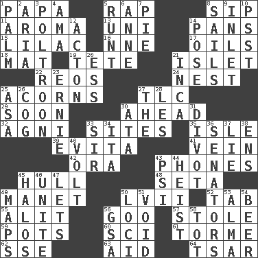 ACROSS 1. Dad 5. Hit sharply and swiftly 8. Small drink 11. Scent 13. Single; one (prefix) 14. Baking dishes 15. Pale purple color 16. Compass dir. 17. Lubricates 18. Floor protector 19. False hair 21. Small island 22. Vintage cars 24. A home for chicks 25. Oak nuts 27. Affectionate concern, for short 29. Within a short period 30. Forward in time 32. Hindu god of fire 33. Settings 35. Capri or Wright 39. Webber/Rice musical 41. Distinctive style or manner 42. Mouth or opening 43. Gives a jingle 45. Frame or body of a ship 48. Stalk of a moss capsule 49. French painter Edouard 50. 57 in ancient Rome 52. Bar bill 55. Came down and settled, as after flight 56. Thick or sticky substance 57. Took without asking 59. Cooking vessels 60. _-fi 61. Singer Mel 62. Compass dir. 63. Assist 64. Russian ruler of old DOWN 1. Inside of hand 2. Roberta Peters solo 3. Coward 4. Wet nurse (var.) 5. Undersized animal 6. Queen of England 1702-14 7. Sliced dessert 8. Travel by water 9. An arm off of a larger body of water 10. Inconspicuous attention getter 12. NE Massachussets city 14. Airs 20. Curvy letter 21. South American Indian 23. Bert's buddy 25. White ___ sheet 26. Gear tooth 27. Definite Article 28. French article 30. "One Day ___ Time" 31. A piece of turf (Scot.) 33. Title for a knight 34. Call ___ day 36. Elected representatives 37. Whopper 38. Followers of ems 40. Electrical Unit 43. Air pressure measure (abbr.) 44. Robbery 45. Rings 46. Join together 47. Allows 49. Atlas contents 50. Venues 51. Lacking any legal or binding force 53. _ mater 54. Fermented drink made from hops 56. Girls' org. (abbr.) 58. Small child