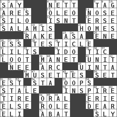 ACROSS 1. Declare 4. Remaining after all deductions 8. Label 11. Ancient Greek god of war 13. Margarine 14. Sense of smell 15. Grain storage tower 16. Is not 17. Celtic language 18. Deli grouping 21. Dwellings 22. Immoral or dissolute person 23. White ___ sheet 25. Compass dir. 26. Curvy letter 29. A testis 32. Ms. Damita and namesakes 34. Wedding promise 35. Nervous spasm 38. Plunder 39. French painter Edouard 41. A single undivided whole 43. Born 44. Curve 45. National forest in Provo, Utah 46. French bagpipes 50. Put into a specified state 51. Eastern Standard Time (abbr.) 54. R.R. building 55. I made a mistake 57. Showing deterioration from age 59. Motivate 63. Become fatigued 64. Spoken 67. One of the Great Lakes 68. Otherwise 69. Hero or heavy, e.g. 70. Letter starter 71. Connecticut Ivy Leaguer 72. Blind as ____ 73. Secret DOWN 1. Backtalk 2. Operatic vocal solo 3. Shout 4. Annoying sounds 5. Raised railways 6. "___ Little Indians" 7. Small child 8. Singer Mel 9. NE Netherlands city 10. Honkers 12. Fly high 14. Modern: prefix 19. Floor coverings 20. Mamie's husband 21. Actor Linden 23. Assistant 24. Native of Scotland 26. Pipe bend 27. The Jewish people; Israel 28. _ gin 30. Colored lightly or faintly 31. Needle holder 33. A distinct part 36. Taverns 37. Quote 39. Vertical spar for supporting sails 40. Type of rug 42. Make lace 45. United States Postal Service (abbr.) 47. Purpose 48. Bathroom 49. A really long time 51. First name in cosmetics 52. Not moving 53. Tarsus (plural) 56. Hurried 58. Area sheltered from the wind 60. Angers 61. Monetary unit of Yemen 62. Suggestive of the supernatural 64. Mouth or opening 65. Director Reiner 66. According to
