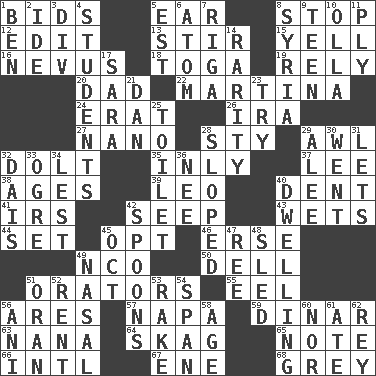 ACROSS 1. Auction offers 5. Ewer handle 8. Obstruct or block passage 12. Prepare for publication 13. Move through with a circular motion 15. Shout 16. Mole, birthmark 18. Ancient Roman robe 19. Trust 20. June honoree 22. Chrissie's court nemesis 24. Part of Q.E.F. 26. Retirement account (abbr.) 27. Billionth: prefix 28. Filthy place 29. Leather borer 32. Stupid person 35. In an inward manner 37. Area sheltered from the wind 38. Eras 39. Lion 40. Scratch 41. Big collection agency 42. Ooze 43. Moistens 44. Arrange properly for use 45. Choose 46. Celtic language 49. Non-commissioned officer (abbr.) 50. Small valley 51. Speakers 55. Snakelike fish 56. Ancient Greek god of war 57. California wine valley 59. Middle Eastern gold or silver currency 63. Grandmother 64. Heroin 65. Brief written record 66. International (abbr.) 67. Compass dir. 68. Jennifer or Joel DOWN 1. Benjamin's nick name 2. Binary compound 3. HTML Container Element 4. SAT takers 5. Eastern Standard Time (abbr.) 6. Tiny particle 7. Port city in Latvia 8. Damascus' land 9. Adolescent 10. Rounded earthenware pot or jar 11. Travel a route regularly 14. Noteworthy scarcity 17. "Two Mules for Sister ____" 21. One of the 12 tribes of Israel 23. Attempt to accomplish something 25. Bathroom plumbing fixture 28. Inclined 29. Toward shelter 30. Gone 31. Allows 32. Raised platform 33. Legendary monster 34. For fear that 36. Born 40. Home 42. Soup utensils 45. Sep. follower 47. To sift 48. Downhill vehicle 49. Relating to the nose 51. Northwest Algerian city 52. Monthly bill 53. Immoral or dissolute person 54. Connect, as a bridge 56. Black tropical American cuckoo 58. Ripen 60. Or not 61. Had dinner 62. Marina Del _, California