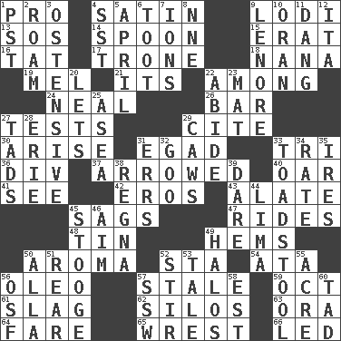 ACROSS 1. Adept person 4. Smooth fabric 9. Farming town in central California 13. Distress signal 14. Soup utensil 15. Part of Q.E.F. 16. Make lace 17. Marketplace scale 18. Grandmother 19. Cartoonist voice _ Blanc 21. ___ a Wonderful Life 22. Amid 24. Anneal 26. Drinking establishment 27. Trials 29. Quote 30. Originate 31. Mild oath 33. Three (prefix) 36. HTML Container Element 37. Moved like an arrow 40. Rowing implement 41. Observe 42. Greek god of love 43. Having winglike extensions 45. Droops 47. Amusement-park features 48. Shallow baking pan 49. Cloth borders 50. Odor 52. R.R. building 54. "One Day ___ Time" 56. Margarine 57. Showing deterioration from age 59. Sep. follower 61. Volcanic refuse 62. Grain storage towers 63. Mouth or opening 64. Conductor's collection 65. Obtain by seizing forcibly or violently 66. Directed DOWN 1. Pacific Standard Time (abbr.) 2. Wander 3. Clearly or manifestly demonstrative 4. Fast jet (abbr.) 5. Showery time 6. A blast of a horn 7. Charged particles 8. Compass dir. 9. Poe poem 10. NW Algerian seaport 11. Mild oath, euphamism for damn 12. Call ___ day 20. Allows 22. Stay 23. Floor covering 25. Toward the sea 27. Bits 28. One of the Great Lakes 29. Crow sounds 31. Blunders 32. Thick or sticky substance 33. Inedible or poisonous agaric 34. Assign a rank or rating to 35. Angers 38. Rain (Swedish) 39. Have the gumption 44. Pale green bean 45. Moe Howard, for one 46. Direct toward a target or goal 49. Rings 50. Silent film actress Nazimova 51. Hitchcock's "____ Window" 52. Tumult 53. Story 55. Measure of real estate 56. Order of Saint Francis (abbr.) 57. Compass dir. 58. Eastern Standard Time (abbr.) 60. Small amount or degree