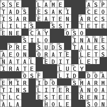 ACROSS 1. Compass dir. 4. Unable to walk 8. Viper 11. Bits 13. 1973 Nobel Price Winner (Physics) Leo 15. Corporate head (abbr.) 16. Austrian river, tributary to the Danube 17. Ingested 18. Arches 19. Ms. Damita and namesakes 21. Fast jet (abbr.) 22. False hair 23. Compass dir. 24. Island 27. Bear (Spanish) 29. Grain storage tower 30. Lacking in sense or substance 34. Before (prefix) 36. Beer foam 39. Lies 40. Age 41. Speak pompously 43. Allows 44. Relating to or accompanying birth 46. Prepare for publication 47. Allow 48. Feeling or showing extreme anger 49. "I Love _" 51. Order of Saint Francis (abbr.) 53. Flaplike covering 54. ___ good deed 57. Independent ruler or chieftain 60. Wedding promise 63. Excessive but superficial compliments 65. Metal containers 66. 61 cubic inches 69. Small Philippine buffalo 70. Affectionate concern, for short 71. First name in cosmetics 72. Painter Guido (1575-1642) 73. Insect wing 74. Hollow 75. Male child DOWN 1. Vertical member of a panel or frame 2. Indian antelope 3. Peak District village in England 4. Area sheltered from the wind 5. White ___ sheet 6. Floor protectors 7. Makes supply last 8. 43,560 square feet 9. Religious group 10. Airs 12. Indian title of respect (Mr.) 14. To the inside or interior of 18. Lacking a tonal center or key 20. _-fi 25. In addition 26. You are 28. Be seated 29. Elected representatives 31. Toward shelter 32. Remaining after all deductions 33. Curvy letter 34. Lightbulb-shaped fruit 35. Round or rotation of duties 37. June honoree 38. Free from disturbance or agitation 40. Black tropical American cuckoo 42. Needle case 45. French article 50. Music discs 52. Do some clerical work 54. Natives or inhabitants of Denmark 55. U. of Maine site 56. At full speed 57. Singer James 58. Place where flour is made 59. South American Indian 61. Food container 62. "Beetle Bailey" pooch 64. Third mo. 67. Snakelike fish 68. Portuguese money of account (variant)