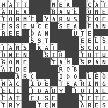 ACROSS 1. Electrical Unit 5. Teachers' org. 8. Feline 11. Type of rug 12. Object of repulsion 14. Single 15. Singer Mel 17. Entertaining tales 18. Enemy 19. Core 21. Ocean 22. Avid follower 23. Portuguese money of account (variant) 24. Daniel's nick name 25. Shoshoni 27. Fast jet (abbr.) 28. Snakelike fish 31. Scottish caps 35. Krazy ___ of comics 37. Highlander 38. Presage 39. Title for a knight 41. Ballerina skirt 42. Went 43. Scottish cap 45. Connect, as a bridge 46. Helper 47. Director Reiner 49. Curve 51. Wedding promise 52. Lion 55. Big _ 57. Binary compound 60. Pulling apart 62. Connecticut Ivy Leaguer 63. Sycophant 65. Add up to 66. Erode 67. Otherwise 68. False hair 69. Attempt 70. "___ Little Indians" 71. Ancient Greek god of war DOWN 1. Wetness 2. Came up 3. Laconic 4. Docile 5. Basketball assoc. 6. Hearing organs 7. Queen of England 1702-14 8. Java holder (2 wds.) 9. Small Philippine buffalo 10. Adolescent 13. He sold his birthright 16. Conclusions 17. Gossips 20. Keg 26. Trials 29. Globular water bottle used in Asia 30. Astound 31. Ancient Roman robe 32. Mine, in Marseilles 33. Ananias' fault 34. Contemptuous expression 36. Teat (slang) 40. Noteworthy scarcity 44. Method 48. Water vessel 50. Quote 52. 61 cubic inches 53. Related on the mother's side 54. Stares 55. Rendezvous 56. Having or resembling wings 58. Dunce 59. Relaxation 61. Round or rotation of duties 64. Lair