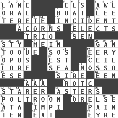 ACROSS 1. Unable to walk 5. Raised railways 8. Leather borer 11. Spoken 12. Water vessel 13. Area sheltered from the wind 14. Cigar-shaped 17. Happening 19. Oak nuts 21. Opts 22. Musical group of three 23. Elected rep. 24. Filthy place 27. Count _ (2 wds.) 29. Separate the seeds from cotton 32. Woman's close-fitting hat 34. Mayday 36. Suggestive of the supernatural 37. Musical composition 38. Eastern Standard Time (abbr.) 39. To provide with a ceiling 40. Old wives' tales, e.g. 41. Ocean 42. With motion or animation 43. Compass dir. 44. Father 46. Car or cant ending 47. Auto club (abbr.) 50. College mil. group 52. A viewer who gazes fixedly 55. Michaelmas daisies 57. Coward 59. Threatening words 62. "One Day ___ Time" 63. Body of Kaffir warriors 64. Ache 65. Nine, plus one 66. Erode 67. Jane of fiction DOWN 1. Car dealer's back yard 2. "We ___ not amused" (Victoria) 3. Hindu Mythology: god of death 4. Voters do this 5. A really long time 6. Shoestrings 7. Vertical member of a panel or frame 8. Actor Baldwin 9. Left 10. Allows 12. Altar cloth linen 15. Singer Mel 16. 4th largest of the Great Lakes 18. Lair 20. Annoying sounds 24. Fur scarf 25. Traditional theme or motif 26. You are 28. Olfactory organs 29. Honkers 30. Get up 31. Thermoplastic polyamide 33. Purpose 35. Flight of steps 36. Environmental prefix 42. Distance measurement 45. Printing process, for short 47. Tate display 48. Nest on high 49. Odor 51. Streamer paper 52. Argument over a trivial matter 53. Lug 54. Actor Alda or Thicke 55. Black tropical American cuckoo 56. Kill 58. Choose 60. Title for a knight 61. Compass dir.