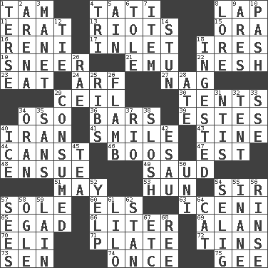 ACROSS 1. Scottish cap 4. Jacques of French films 8. Pet locale 11. Part of Q.E.F. 13. Disturbances 15. Mouth or opening 16. Painter Guido (1575-1642) 17. An arm off of a larger body of water 18. Angers 19. Scornful expression 21. Australian flightless bird 22. Soft 23. Erode 24. Sandy's bark 27. Tired old horse 29. To provide with a ceiling 30. Portable shelters 34. Bear (Spanish) 36. Taverns 39. _____ Park, CO 40. SW Asia republic 41. Grin 43. Prong on a fork 44. 2nd pers. sing. pres. of can (arch.) 46. Scornful sounds 47. Eastern Standard Time (abbr.) 48. Take place subsequently 49. Saudi Arabian king (1953-1964) 51. Can I? 53. Attila the _ 54. Title for a knight 57. Not divided or shared with others 60. Raised railways 63. Ancient Celtic tribe of eastern Britain 65. Mild oath 66. 61 cubic inches 69. ____ Jay Lerner 70. Biblical high priest 71. Food holder 72. Canisters 73. Elected rep. 74. At one time in the past 75. Turn to the right DOWN 1. Laconic 2. Sports stadium 3. French painter Edouard 4. Three (prefix) 5. The 18th letter of the Arabic alphabet 6. Lacquered or enameled metalware 7. Detail 8. Old wives' tales, e.g. 9. Ancient Greek god of war 10. Romantic infatuation 12. Neckwear 14. Surprise greatly 18. Consumed 20. Actress Charlotte 25. Teases 26. Flambe (short form) 28. Had dinner 29. Eaten 31. Nuclear Threat Initiatives 32. Portable shelter 33. Compass dir. 34. NW Algerian seaport 35. Without 37. River (Sp.) 38. Splash clumsily 40. Frozen water 42. Son of Isaac 45. Afternoon social gathering 50. University (slang) 52. Sharp bark 54. Former Milwaukee Brewers owner Bud 55. Empty; void 56. Remove soap 57. Perceives with the eye 58. Stare at amorously 59. (Had) reclined 61. _ and Stitch 62. Comedian Laurel of Laurel & Hardy 64. Feline 67. And so on (abbr.) 68. To sift