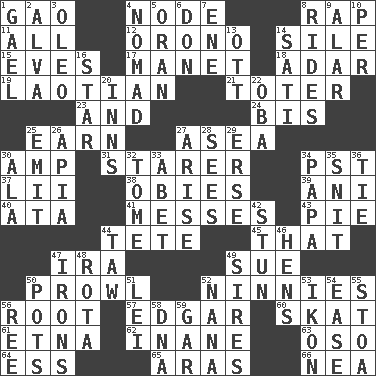 ACROSS 1. E Mali city 4. Thickened enlargement 8. Hit sharply and swiftly 11. Everything 12. U. of Maine site 14. Drop; flow; fall 15. Nights before holidays 17. French painter Edouard 18. The sixth month of the Jewish calendar 19. Of or relating to Laos or its people 21. Carrier 23. Also 24. Again 25. Merit 27. At sea 30. Electrical Unit 31. A viewer who gazes fixedly 34. Pacific Standard Time (abbr.) 37. Cards in a Roman deck? 38. Off-Broadway awards 39. Cuckoo 40. _ moment's notice (2 wds.) 41. Makes clutter 43. Sliced dessert 44. Wig 45. Not this but _ 47. Lyricist Gershwin 49. Institute legal proceedings 50. Move like a hungry wolf 52. Fools 56. Carrot, for example 57. _ Allan Poe 60. Three-handed card game 61. Inactive volcano in Sicily 62. Lacking in sense or substance 63. Bear (Spanish) 64. Double-curved letter 65. Caspian sea tributary 66. Teachers' org. DOWN 1. Highlander 2. Inventor's middle name 3. Margarine 4. Roamer 5. Northwest Algerian city 6. Spanish title 7. Compass dir. 8. Amusement-park features 9. Having or resembling wings 10. For each 13. Baseball player Mel 14. Suttee (variant) 16. Play the lead 20. Taverns 22. Chief or king in Benin or Nigeria 25. Send forth 26. Capital of Western Samoa 27. Originate 28. Perceives with the eye 29. Celtic language 30. Insect wing 32. Heavy book 33. Collude with 34. Dad 35. In a ____ (agitated or irritated) 36. Standoff 42. Surprise greatly 44. The 23rd letter of the Hebrew alphabet 46. Coop moms 47. Removes the wrinkles 48. Roll call or roster of names 49. Founders of families 50. Cooking vessels 51. Luau accessory 52. Grandmother 53. Image 54. Relaxation 55. Portico 56. To riddle 58. Heredity factor (abbr.) 59. Slender fish