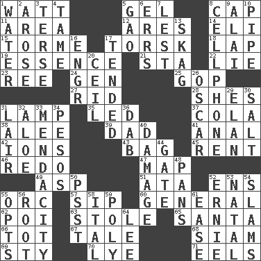 ACROSS 1. Electrical Unit 5. Set 8. Head covering 11. Type of rug 12. Ancient Greek god of war 14. Connecticut Ivy Leaguer 15. Singer Mel 17. Cod relative 18. Pet locale 19. Core 21. R.R. building 22. Whopper 23. To separate or throw off 24. Commissioned military rank (abbr.) 25. Republican Party 27. To free from 28. "______ My Girl" (Turtles hit) 31. Desk light 35. Directed 37. Root beer relative 38. Toward shelter 39. June honoree 41. Of or related to the anus 42. Charged atoms 43. Paper or plastic container 45. Monthly bill 46. Do over again 47. Atlas unit 49. Cleo's killer 51. _ moment's notice (2 wds.) 52. Followers of ems 55. The grampus (Milton) 57. Small drink 60. Commissioned military rank 62. Luau course 63. Took without asking 65. Before Barbara or Clara 66. Small child 67. Lie 68. Thailand, formerly 69. Filthy place 70. Sodium hydroxide 71. Snakelike fish DOWN 1. Wetness 2. Came up 3. Laconic 4. Not wild 5. E Mali city 6. Blunders 7. For fear that 8. Portable communications device 9. Mountain range southwest of Kyrgyzstan 10. Corncob 13. Heroin 16. Engineer (abbr.) 17. Looked after 20. To provide with a ceiling 26. Motion picture award 29. Style 30. Table seasoning 31. Den 32. _ vera 33. Ananias' fault 34. Mexican monetary units 36. Pat or tap gently 40. Break 44. Yard entry 48. Baking dishes 50. Inconspicuous attention getter 52. Bert's buddy 53. Brizilian seaport 54. Hits or strikes with great force 55. Chooses 56. Carrot, for example 58. Slanted text style (abbr.) 59. Many (prefix) 61. Comfort 64. Area sheltered from the wind