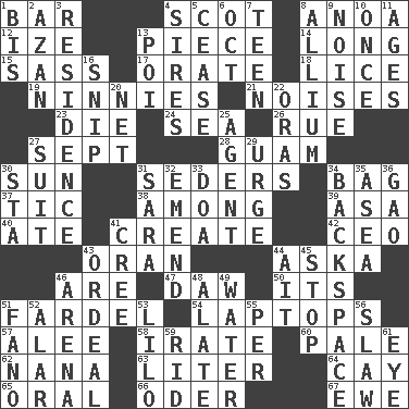 ACROSS 1. Drinking establishment 4. Highlander 8. Small Philippine buffalo 12. Ending with capital 13. Component 14. Having great length 15. Backtalk 17. Speak pompously 18. Louse (plural) 19. Fools 21. Annoying sounds 23. Pass on 24. Ocean 26. Regret 27. Back-to-school mo. 28. Island territory of the United States 30. Player for Phoenix 31. Spring feasts 34. Paper or plastic container 37. Nervous spasm 38. Amid 39. White ___ sheet 40. Had dinner 41. Make 42. Corporate head (abbr.) 43. NW Algerian seaport 44. "____ silly question..." 46. "We ___ not amused" (Victoria) 47. Obsolete 50. It is 51. Pack 54. Portable computers 57. Toward shelter 58. Feeling or showing extreme anger 60. Light colored 62. Grandmother 63. 61 cubic inches 64. Island 65. Relating to the mouth 66. Baltic tributary 67. She-sheep DOWN 1. Altar cloth linen 2. Muslim summons to prayer 3. Dwelling 4. Begets 5. Desist 6. Sep. follower 7. Adolescent 8. Plant genus of onion and garlic 9. Annoying sound 10. Single time 11. Ripens 13. Luau course 16. Clip 20. Fish or hair follower 22. Mouths or openings 25. Representative 27. Set or collection 29. Goad 30. R.R. building 31. "Two Mules for Sister ____" 32. Make improvements or corrections to 33. ___ good deed 34. Keyboard key 35. Toward the sea 36. E Mali city 41. Algonquian 43. Severe or trying experience 44. Small island 45. Halt 46. Sports stadium 48. Having winglike extensions 49. Wetness 51. Papal veil 52. Having or resembling wings 53. _ and Stitch 55. For each 56. Cole _ (cabbage dish) 59. To free from 61. Sight organ