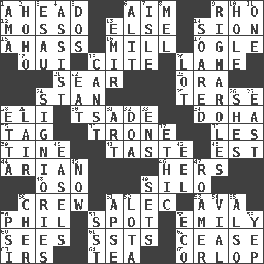 ACROSS 1. Having the leading position 6. Direct toward a target or goal 9. 17th letter of the Greek alphabet 12. With motion or animation 13. Otherwise 14. The Jewish people; Israel 15. Collect or gather 16. Place where flour is made 17. Stare 18. Fr. "Yes" 19. Quote 20. Unable to walk 21. Shrivel 23. Mouth or opening 24. Comedian Laurel of Laurel & Hardy 25. Laconic 28. Biblical high priest 30. Sadhe (variant) 34. Capital of the state of Qatar 35. Label 36. Marketplace scale 38. French article 39. Prong on a fork 41. Clothes sense 43. Eastern Standard Time (abbr.) 44. Believer in; advocate of (suffix) 46. Possessive pronoun 48. Bear (Spanish) 49. Grain storage tower 50. Group working together 51. Actor Baldwin 53. Actress Gardner 56. Silvers or Donahue 57. Specific locale 58. Poet Dickinson 60. Perceives with the eye 61. Fast planes 62. Stop 63. Big collection agency 64. Beverage made from leaves 65. Lowest deck of a ship DOWN 1. Nursemaid (var.) 2. Like (prefix) 3. Son of Isaac 4. Help 5. Two (Sp.) 6. Set down 7. Capri or Wright 8. Cartoonist voice _ Blanc 9. Frustrating wastes of time 10. Opening into or through something 11. Single 13. Arab leader 14. Flew 19. 2nd pers. sing. pres. of can (arch.) 20. Car dealer's back yard 22. Erode 24. Seigniories (variant) 26. "______ My Girl" (Turtles hit) 27. Compass direction 28. Singer James 29. Den 31. Nonscientific branch of learning 32. ___ good deed 33. Followers of ems 37. Value system 40. Artist's stands 42. Snakelike fish 45. At this time 47. Wanderer 49. Puts into a specified state 50. "Mermaids" star 51. Domed church section 52. Globular water bottle used in Asia 54. Small bottle 55. In addition 56. Air pressure measure (abbr.) 57. Fast jet (abbr.) 58. Environmental prefix 59. Slangy assent