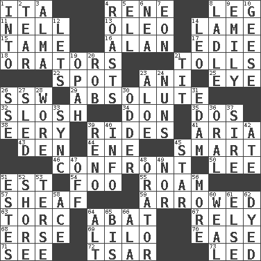 ACROSS 1. Call ___ day 4. French philosopher Descartes 8. Part of a journey 11. 1994 drama film starring Jodie Foster 13. Margarine 14. Unable to walk 15. Not wild 16. ____ Jay Lerner 17. Singer Brickell 18. Speakers 21. For Whom the Bell _____ 22. Blemish 23. Cuckoo 25. Sight organ 26. Compass dir. 29. Utter; complete 32. Splash clumsily 34. Spanish title 35. Two (Sp.) 38. Suggestive of the supernatural 39. Amusement-park features 41. Operatic vocal solo 43. Lair 44. Compass dir. 45. Don Adams' spy role 46. Meet 50. Area sheltered from the wind 51. Eastern Standard Time (abbr.) 54. Egg _ yung 55. Wander 57. To gather and bind into a bundle 59. Moved like an arrow 63. Torque (variant) 64. Blind as ____ 67. Trust 68. Celtic language 69. _ and Stitch 70. Comfort 71. Perceive with the eye 72. Russian ruler of old 73. Directed DOWN 1. To the inside or interior of 2. Rend 3. _ mater 4. Exposes to great heat 5. Pipe bend 6. Teachers' org. 7. Period of immesurable duration 8. Dipping utensil 9. Poet Dickinson 10. Honkers 12. Allows 14. Lion 19. Brightly colored fish 20. Director Reiner 21. Teat (slang) 23. _ vera 24. Religious women 26. Compass dir. 27. Downhill vehicle 28. Had on 30. More peculiar 31. Dutch treat 33. Synchronize (abbr.) 36. Spoken 37. Title for a man of rank and authority 39. Former U.S. Attorney General Janet 40. A message received and understood 42. Had dinner 45. Play the lead 47. Below a satisfactory level 48. Speaker 49. And not 51. _____ Park, CO 52. Dinah or Pauly 53. Laconic 56. Greater amount 58. Adept person 60. Welt 61. Otherwise 62. Colored 64. The first octave above the treble staff 65. Altar cloth linen 66. Wing