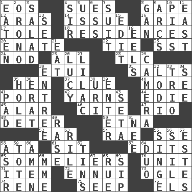 ACROSS 1. Greek goddess of the dawn 4. Takes to court 8. Open wide 12. Ancient river in northeast Turkey 14. Come out of 16. Operatic vocal solo 17. Lacquered or enameled metalware 18. Homes 20. Related on the mother's side 22. Make a knot 23. Fast jet (abbr.) 24. Dreamland 25. Everything 28. Affectionate concern, for short 30. Needle case 31. Table seasonings 35. Layer 37. A slight indication 40. Greater amount 41. Sweet dark-red dessert wine 42. Entertaining tales 44. Singer Brickell 45. Having or resembling wings 46. Quote 47. River (Sp.) 48. Prevent from occurring 50. Inactive volcano in Sicily 52. Ewer handle 54. Actress Charlotte 55. Compass dir. 58. _ moment's notice (2 wds.) 61. Be seated 63. Proofreads 65. Wine waiters 70. A single undivided whole 71. A whole individual unit 72. World-weariness 73. Stare 74. French philosopher Descartes 75. Ooze 76. Raised railways DOWN 1. Ingested 2. U. of Maine site 3. Vegetable dish 4. Title for a knight 5. Purpose 6. Double-curved letter 7. Set of matching outer garments 8. Separate the seeds from cotton 9. Arches 10. Sliced desserts 11. Compass direction 13. Put into a specified state 15. Prepare for publication 19. Snakelike fish 21. Ingest 26. "I Love _" 27. Pale purple color 29. Device for capturing images 30. Main course 32. Farming town in central California 33. Musical group of three 34. Perceive with the eye 35. Hollow 36. Part of Q.E.F. 38. RI univ. 39. Keyboard key 41. Writing tablet 43. Stalk of a moss capsule 49. To erase 51. Born 53. Cause heat under the collar 55. Scorch 56. Free of sound 57. _____ Park, CO 58. SW Saudi Arabia district 59. Lug 60. So be it 62. Airtight sealed metal containers 64. Superhero pair 66. Madame (abbr.) 67. Compass dir. 68. Sorrow 69. Small drink