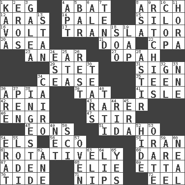 ACROSS 1. Barrel 4. Blind as ____ 8. Bowlike part 12. Caspian sea tributary 14. Light colored 15. Grain storage tower 16. Electrical Unit 17. Interpreter 20. Toward the sea 21. ___ good deed 22. Accounting whiz (abbr.) 23. Approach 27. Brightly colored fish 29. Proofreading order 31. Signal 34. Desist 35. Adolescent 36. Capital of Western Samoa 39. Make lace 41. Capri or Wright 42. Painter Guido (1575-1642) 43. Less widely known 46. Engineer (abbr.) 47. Agitate 48. Immeasurably long periods of time 51. Potato state 54. Raised railways 56. Environmental prefix 58. SW Asia republic 61. Happening in regular succession 66. Have the gumption 67. Arabian gulf 68. Writer Wiesel 69. Singer James 70. Periodic rise and fall of the sea level 71. Cuts off 72. Snakelike fish DOWN 1. Polynesian shrub of the pepper family 2. Greek god of love 3. An organ shaped like a helmet 4. Fitting 5. Drinking establishment 6. Insect wing 7. Watch over 8. White ___ sheet 9. Actors Guy, Robert Welles, and Clint 10. Hoof sound 11. Israeli folk dance 13. Comedian Laurel of Laurel & Hardy 18. "Barney Miller" actor Jack 19. Infant locale 24. Compass dir. 25. "One Day ___ Time" 26. State of inaction 28. Moving or stirring 30. Pulls apart 32. Set 33. Compass dir. 34. Capital of Egypt 36. "We ___ not amused" (Victoria) 37. Writing instrument 38. Eaten 40. Jacques of French films 44. To free from 45. Period 49. Fish or hair follower 50. _-fi 52. Flintstone garb 53. Declaim 54. Part of Q.E.F. 55. Farming town in central California 57. Baking chamber 59. Johnson of "Laugh-In" 60. Actress Patricia 62. A saturated hydrocarbon 63. Connecticut Ivy Leaguer 64. Mouth edge 65. Consenting reply