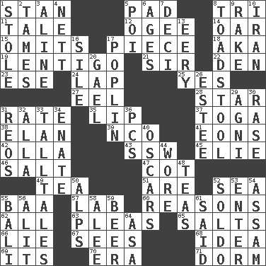 ACROSS 1. Comedian Laurel of Laurel & Hardy 5. Groovy apt. 8. Three (prefix) 11. Story 12. Double curve, resembling the letter S 14. Rowing implement 15. Leaves out 17. Part 18. Alias (abbr.) 19. Small, flat, pigmented spot on the skin 21. Title for a knight 22. Lair 23. Compass dir. 24. Pet locale 25. It is so 27. Snakelike fish 28. Play the lead 31. Assign a rank or rating to 35. Mouth edge 37. Ancient Roman robe 38. Liveliness 39. Non-commissioned officer (abbr.) 41. Immeasurably long periods of time 42. Water jar 43. Compass dir. 45. Writer Wiesel 46. Table seasoning 47. Small bed 49. Afternoon social gathering 51. "We ___ not amused" (Victoria) 52. Ocean 55. Sound made by sheep 57. Experiment locale 60. Thinks logically 62. 100% 63. Entreaties 65. Table seasonings 66. Falsehood 67. Perceives with the eye 68. The content of cognition 69. It is 70. Epoch 71. Dormintory (informal) DOWN 1. Fur scarf 2. Softens 3. Place in a line 4. Remaining after all deductions 5. Luau course 6. Matures 7. Tenth: prefix 8. Inedible or poisonous agaric 9. Immoral or dissolute person 10. SW Asia republic 13. Suggestive of the supernatural 16. Filth; sediment 17. Cotton for raincoats, e.g. 20. Highlander 26. First name in cosmetics 29. Hindu god of fire 30. To erase 31. Vintage cars 32. Silent film actress Nazimova 33. Baron Munchausen's specialties 34. Related on the mother's side 36. Personal Computers (abbr.) 40. Motion picture awards 44. Had on 48. Beverages made from leaves 50. High mountains 52. Twentieth part of a lira 53. Keyboard key 54. Indian state 55. Indonesian resort city 56. Came down and settled, as after flight 58. Toward shelter 59. Fermented drink made from hops 61. Stated 64. White ___ sheet