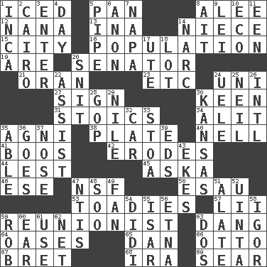 ACROSS 1. On the rocks 5. Baking dish 8. Toward shelter 12. Grandmother 13. _ tizzy (2 wds.) 14. Sibling's daughter 15. Municipality 16. Census information 19. "We ___ not amused" (Victoria) 20. Legislator 21. NW Algerian seaport 23. And so on (abbr.) 24. Single; one (prefix) 27. Public display of a written message 30. Peachy ____! 31. Unemotional ones 34. Set down 35. Hindu god of fire 38. Food holder 40. 1994 drama film starring Jodie Foster 41. Scornful sounds 42. Eats (away) 44. For fear that 45. "____ silly question..." 46. Compass dir. 47. Overdraft (abbr.) 50. Son of Isaac 53. Sycophants 57. Cards in a Roman deck? 59. One who advocates reunion 63. Mild oath, euphamism for damn 64. Fertile tracts in a desert 65. One of the 12 tribes of Israel 66. Von Bismarck 67. Cy Young winner Saberhagen 68. Lyricist Gershwin 69. Burn superficially DOWN 1. South American Indian 2. Capital of Egypt 3. Keyboard key 4. 24 hours 5. Corncob 6. At once, immediately (arch.) 7. California wine valley 8. Small island 9. Flowery wreath 10. Environmental prefix 11. Car or cant ending 14. Drug cop 17. Shoshoni 18. Car dealer's back yard 20. In a ____ (agitated or irritated) 22. Aid 24. Ubangi River tributary 25. Famous astronaut Armstrong 26. International (abbr.) 28. Republican Party 29. The longest river in the world 30. Sunflower state 32. 4-wheeled motor vehicle 33. Portico 35. Competent 36. Travels 37. Olfactory organ 39. Begley and Asner 43. Supplements with great effort 47. Nuclear Threat Initiatives 48. "Barney Miller" actor Jack 49. Avid follower 51. Having winglike extensions 52. National forest in Provo, Utah 54. "You Light Up My Life" star Conn 55. Austrian river, tributary to the Danube 56. Inactive volcano in Sicily 58. Composer Stravinsky 59. Director Reiner 60. Ewer handle 61. Purpose 62. Fish or hair follower 63. Two (Sp.)