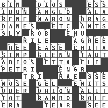 ACROSS 1. Storage container 4. "Vaya con ____" 8. Curvy letter 11. Goddess of spring and wife of Bragi 13. White American of non-Hispanic descent 15. Insect wing 16. French philosopher Descartes 17. Make _____ (do battle with) 18. To draw with force 19. Natives or inhabitants of Denmark 21. And so on (abbr.) 22. Pismires 23. Roguish 24. Director Reiner 27. Australian flightless bird 29. Cause heat under the collar 30. Match 34. To sift 36. Comfort 39. Riviera of "Kiss of the Spider Woman" 40. Simple or foolish person 41. American astronaut and politician John 43. Tense 44. Goodbye (Sp.) 46. Singer James 47. Connecticut Ivy Leaguer 48. _ dish (used to culture cells) 49. Engineer (abbr.) 51. Three (prefix) 53. Actress Charlotte 54. Compass dir. 57. Sense of smell 60. Set 63. Gives off 65. Baltic tributary 66. Constellation of myth 69. Came down and settled, as after flight 70. Small child 71. Role for Stallone 72. Hero or heavy, e.g. 73. Period 74. Separate forcefully 75. Observe DOWN 1. Avian creatures 2. Perfect 3. Pet term 4. Obsolete 5. _ tizzy (2 wds.) 6. Legendary monster 7. Groove 8. Merit 9. Narrow board 10. Droops 12. Born 14. Single time 18. Female child 20. Indian title of respect (Mr.) 25. Cassini of fashion 26. Memphis, Tenn. Street 28. Big _ 29. Newsperson 31. Monetary unit of Yemen 32. Needle holder 33. Erode 34. Travel on an animal 35. Give off 37. Put into a specified state 38. Keyboard key 40. Plant excrement 42. Grandmother 45. Title for a knight 50. Unit of force equal to gravity 52. Composer Stravinsky 54. Grain storage towers 55. Vertical member of a panel or frame 56. First name in cosmetics 57. Musical sound 58. Scent 59. Bristle 61. Part of Q.E.F. 62. Welles in "The Third Man" 64. Impair 67. Chief or king in Benin or Nigeria 68. Or not