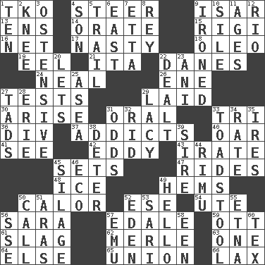 ACROSS 1. Ring climax 4. Guide 9. Austrian river, tributary to the Danube 13. Followers of ems 14. Speak pompously 15. Swiss mountan, "Queen of the Mountains" 16. Fish or hair follower 17. Offensive 18. Butter sub 19. Snakelike fish 21. Call ___ day 22. Natives or inhabitants of Denmark 24. Be tempered by heat 26. Compass dir. 27. Trials 29. Put down 30. Ascend 31. Relating to the mouth 33. Three (prefix) 36. HTML Container Element 37. Inveterate users 40. Boat paddle 41. Perceive with the eye 42. Whirlpool 43. Feeling or showing extreme anger 45. Arranges properly for use 47. Amusement-park features 48. Frozen water 49. Equivocates 50. Bodily heat indicating an inflammation 52. Compass dir. 54. Shoshoni 56. "Two Mules for Sister ____" 57. Peak District village in England 59. Baseball player Mel 61. Volcanic refuse 62. Haggard of country music 63. Single 64. Otherwise 65. The state of being joined or united 66. Not strict DOWN 1. "___ Little Indians" 2. Leg joint 3. Clearly or manifestly demonstrative 4. Male child 5. Drop behind 6. Compass direction 7. Singer James 8. Marina Del _, California 9. Pressed 10. Drop; flow; fall 11. Eons 12. _ de Janeiro 20. Allows 22. Started a card game 23. Black tropical American cuckoo 25. At sea 27. Small boys 28. 4th largest of the Great Lakes 29. Made of lace 31. Likelihood 32. To free from 33. Inedible or poisonous agaric 34. Pace 35. Angers 38. Prevent from occurring 39. Beget 44. Tall New Zealand timber tree 45. Fodder prepared in a silo 46. Environmental prefix 49. Phone greeting 50. Give a ring to 51. Ancient river in northeast Turkey 52. Locale of original sin 53. Indian skirt 55. Inactive volcano in Sicily 56. Compass dir. 57. Australian flightless bird 58. Car or cant ending 60. John Ritter's dad