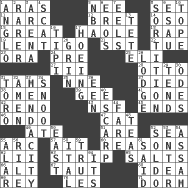 ACROSS 1. Ancient river in northeast Turkey 5. Born 8. Arrange properly for use 11. Drug cop 12. Cy Young winner Saberhagen 14. Bear (Spanish) 15. Relatively large 17. White Person, in Hawaii 18. Reproach for some lapse or misdeed 19. Small, flat, pigmented spot on the skin 21. Fast jet (abbr.) 22. Third day of the wk. 23. Mouth or opening 24. Before (prefix) 25. Biblical high priest 27. One more than two 28. Von Bismarck 31. Scottish caps 35. Compass dir. 37. Passed on 38. Sign of things to come 39. Turn to the right 41. Went 42. Former U.S. Attorney General Janet 43. Science/research agcy. 45. Extremities 46. Southwest Nigerian state 47. Feline 49. Had dinner 51. "We ___ not amused" (Victoria) 52. Ocean 55. Curve 57. Small island 60. Thinks logically 62. Cards in a Roman deck? 63. Empty completely 65. Table seasonings 66. The first octave above the treble staff 67. Tense 68. The content of cognition 69. Marina Del _, California 70. French article 71. Dormintory (informal) DOWN 1. White American of non-Hispanic descent 2. More uncommon 3. Sports stadium 4. Go away! 5. Basketball assoc. 6. Greek god of love 7. Snakelike fish 8. Casting lots 9. He sold his birthright 10. Drink excessively 13. False hair 16. Native american tent (variation) 17. Weeding 20. Broad smile 26. Inn 29. Watch over 30. Lyric poems 31. "Corrida" creature 32. So be it 33. Ananias' fault 34. Snout, nose 36. Car or cant ending 40. Fortification 44. Conductor's collection 48. Afternoon social gatherings 50. 90 degrees 52. Twentieth part of a lira 53. Keyboard key 54. Indian state 55. Having or resembling wings 56. Cause heat under the collar 58. Slanted text style (abbr.) 59. Loyal 61. Alleged 64. ___ a Wonderful Life