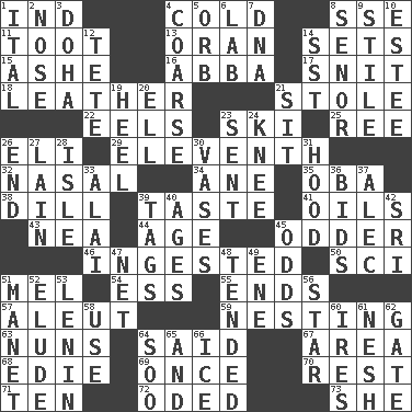 ACROSS 1. Indiana (abbr.) 4. Lacking warmth 8. Compass dir. 11. A blast of a horn 13. NW Algerian seaport 14. Arranges properly for use 15. American tennis player Robert 16. Swedish rock group 17. In a ____ (agitated or irritated) 18. Cordwainer's material 21. Took without asking 22. Snakelike fish 23. What Jean-Claude Killy likes to do 25. To separate or throw off 26. Connecticut Ivy Leaguer 29. Veterans Day date 32. Relating to the nose 34. A saturated hydrocarbon 35. Chief or king in Benin or Nigeria 38. Deli pickle 39. Clothes sense 41. Petroleums 43. Teachers' org. 44. Grow older 45. More peculiar 46. Swallowed 50. _-fi 51. Cartoonist voice _ Blanc 54. Double-curved letter 55. Extremities 57. Eskimo relative 59. Snuggling 63. Religious women 64. Alleged 67. Type of rug 68. Singer Brickell 69. Single time 70. Relief 71. Nine, plus one 72. Wrote a lyric poem 73. A female animal or person DOWN 1. Slanted text style (abbr.) 2. Olfactory organ 3. Capital of the state of Qatar 4. Rough 5. Globe 6. Experiment locale 7. Heredity factor (abbr.) 8. Sir (Sp.) 9. Vertical member of a panel or frame 10. First name in cosmetics 12. Wig 14. Fast jet (abbr.) 19. The bottom of a shoe or boot 20. Pipe bend 21. Be seated 23. Transmitted 24. Leg joint 26. Conclude 27. (Had) reclined 28. Small island 30. Flower holders 31. Parka part 33. Mountain range southwest of Kyrgyzstan 36. Auction offers 37. Actor Baldwin 39. Labels 40. Grows older 42. _ Lanka 45. Probability 47. Fish or hair follower 48. Watched over 49. Compass dir. 51. French painter Edouard 52. Evade 53. Soviet premier 1918-24 56. Play the lead 58. Purpose 60. Angers 61. Delicate 62. Yard entry 64. "Barney Miller" actor Jack 65. Also 66. Frozen water