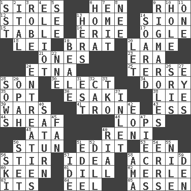 ACROSS 1. Fathers 6. Layer 9. 17th letter of the Greek alphabet 12. Took without asking 13. Residence 14. The Jewish people; Israel 15. Eating place 16. 4th largest of the Great Lakes 17. Stare 18. Flowery wreath 19. Naughty child 20. Unable to walk 21. Singles 23. Epoch 24. Inactive volcano in Sicily 25. Laconic 28. Male child 30. Opt 34. Rowboat 35. Elect 36. 1973 Nobel Price Winner (Physics) Leo 38. Untruth 39. Armed conflicts 41. Marketplace scale 43. Curvy letter 44. Bundle of cut stalks of grain 46. Chops off 48. _ moment's notice (2 wds.) 49. Painter Guido (1575-1642) 50. Surprise greatly 51. Prepare for publication 53. Car or cant ending 56. Agitate 57. The content of cognition 58. Bitter 60. Peachy ____! 61. Deli pickle 62. Haggard of country music 63. ___ a Wonderful Life 64. Snakelike fish 65. NE Netherlands city DOWN 1. Fast jet (abbr.) 2. Slanted text style (abbr.) 3. Loose flowing garment 4. American author Paul (1891-1958) 5. Perceive with the eye 6. Israeli folk dance 7. Give off 8. Born 9. Frustrating wastes of time 10. Opening into or through something 11. Single 13. Possessive pronoun 14. Flew 19. Calif. Air Force Base 20. Allow 22. Compass dir. 24. Pleas 26. Indian titles of respect 27. Snake ____ (dice throw) 28. Sty mamas 29. Brightly colored fish 31. Eastern Standard Time (abbr.) 32. Auto 33. Ring climax 37. An arm off of a larger body of water 40. Titan orbits this 42. Period of immesurable duration 45. Air blower 47. Components 49. Monetary unit of Yemen 50. Proofreading order 51. Singer Brickell 52. Small valley 54. Blunders 55. "Death on the ____" 56. What Jean-Claude Killy likes to do 57. Binary compound 58. Nursemaid (var.) 59. Lair