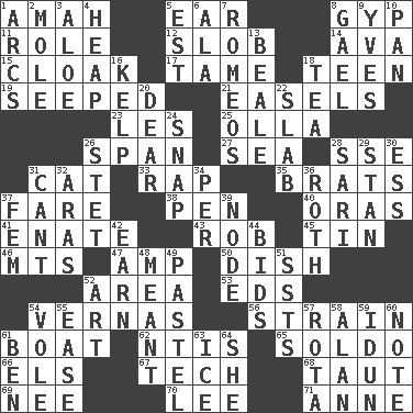 ACROSS 1. Wet nurse 5. Hearing organ 8. Hustle 11. Hero or heavy, e.g. 12. Messy guy 14. Actress Gardner 15. Cover or conceal 17. Docile 18. Adolescent 19. Oozed 21. Artist's stands 23. French article 25. Spanish pot 26. Connect, as a bridge 27. Ocean 28. Compass dir. 31. Domesticated feline 33. Reproach for some lapse or misdeed 35. Naughty children 37. Conductor's collection 38. Fenced enclosure 40. Mouths or openings 41. Maternal 43. Director Reiner 45. Metal container 46. Mountains (abbr.) 47. Electrical Unit 50. Food container 52. Type of rug 53. Begley and Asner 54. Actresses Bloom and Felton 56. Put through a sieve 61. Water vessel 62. Nuclear Threat Initiatives 65. Twentieth part of a lira 66. Raised railways 67. Technical 68. Tense 69. Born 70. Area sheltered from the wind 71. Queen of England 1702-14 DOWN 1. Arches 2. Undercover agent 3. Medicinal plant 4. Pile 5. Eastern Standard Time (abbr.) 6. Insect wing 7. Lover boys 8. Highlander 9. Jacques Cousteau's middle name 10. Baking dish 13. Calif. Air Force Base 16. Seaweed 18. Beverage made from leaves 20. Letter starter 22. Broad, flat, thick piece 24. Fastener 26. Proofreading order 28. Indian skirt 29. Comedian Laurel of Laurel & Hardy 30. Curvy letter 31. Patter 32. Ancient river in northeast Turkey 34. For each 36. Writer of Portnoy's Complaint (1969) 37. Opposite of masc. 39. Connecting point 42. Merit 44. Auction offers 48. Intended 49. Soft color 51. Fast planes 52. Nonscientific branch of learning 54. Grand slam 55. Comfort 57. Roll call or roster of names 58. ____ Jay Lerner 59. Goddess of spring and wife of Bragi 60. Observe 61. Benjamin's nick name 63. Frozen water 64. A female animal or person