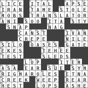 ACROSS 1. Louse (plural) 5. Slanted text style (abbr.) 9. Domed church section 13. SW Asia republic 14. Docile 15. Fur scarf 16. Crowds into 17. Interpreter 19. Cuckoo 20. "Barney Miller" actor Jack 21. Call ___ day 22. Filthy place 23. Fastener 25. Tired old horse 26. 2nd pers. sing. pres. of can (arch.) 30. _ the terrible 34. Streamer paper 35. Mediterranean tributary 36. Grain storage tower 39. Fertile tracts in a desert 42. Yard entry 43. Makes supply last 44. Giggle 46. Trial 47. Bobsleighs 48. Chop off 51. A distinct part 54. White ___ sheet 57. Hearing organ 58. Institute legal proceedings 60. Symbol (abbr.) 62. Complicated, petty procedures 65. Inactive volcano in Sicily 66. Small stream 67. Shed a tear 68. Located in or toward the back 69. Command 70. Chops off 71. American tennis player Robert DOWN 1. Pale green bean 2. Removes the wrinkles 3. Small house or cottage 4. Followers of ems 5. "Tell ____ the Marines!" 6. Pacific island yam 7. Wet nurse (var.) 8. Soviet premier 1918-24 9. "One Day ___ Time" 10. Plant holders 11. Narrow opening 12. Suggestive of the supernatural 15. Volcanic refuse 18. R.R. building 20. Practice fight 24. Buttonhole 27. Modern: prefix 28. Health resort 29. Trials 30. Eat 31. By way of 32. Keyboard modifier key 33. Born 36. Arrange properly for use 37. Mamie's mate 38. French article 40. Snakelike fish 41. A female animal or person 45. Singer Brickell 48. Path through which fluid escapes 49. Boat paddle 50. Move like a hungry wolf 52. _____ Park, CO 53. Non-adult bird? 54. Bowlike part 55. Beget 56. Grows older 58. Ooze 59. United States Postal Service (abbr.) 61. Female horse 63. Was introduced to 64. Lion 65. Epoch